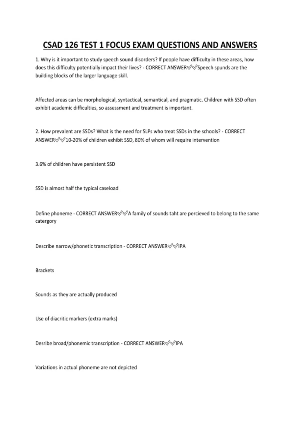 CSAD 126 TEST 1 FOCUS EXAM QUESTIONS AND ANSWERS 1. Why is it important to study speech sound disorders? If people have difficulty in these areas, how does this difficulty potentially impact their lives? - CORRECT ANSWERSpeech spunds are the building blocks of the larger language skill.