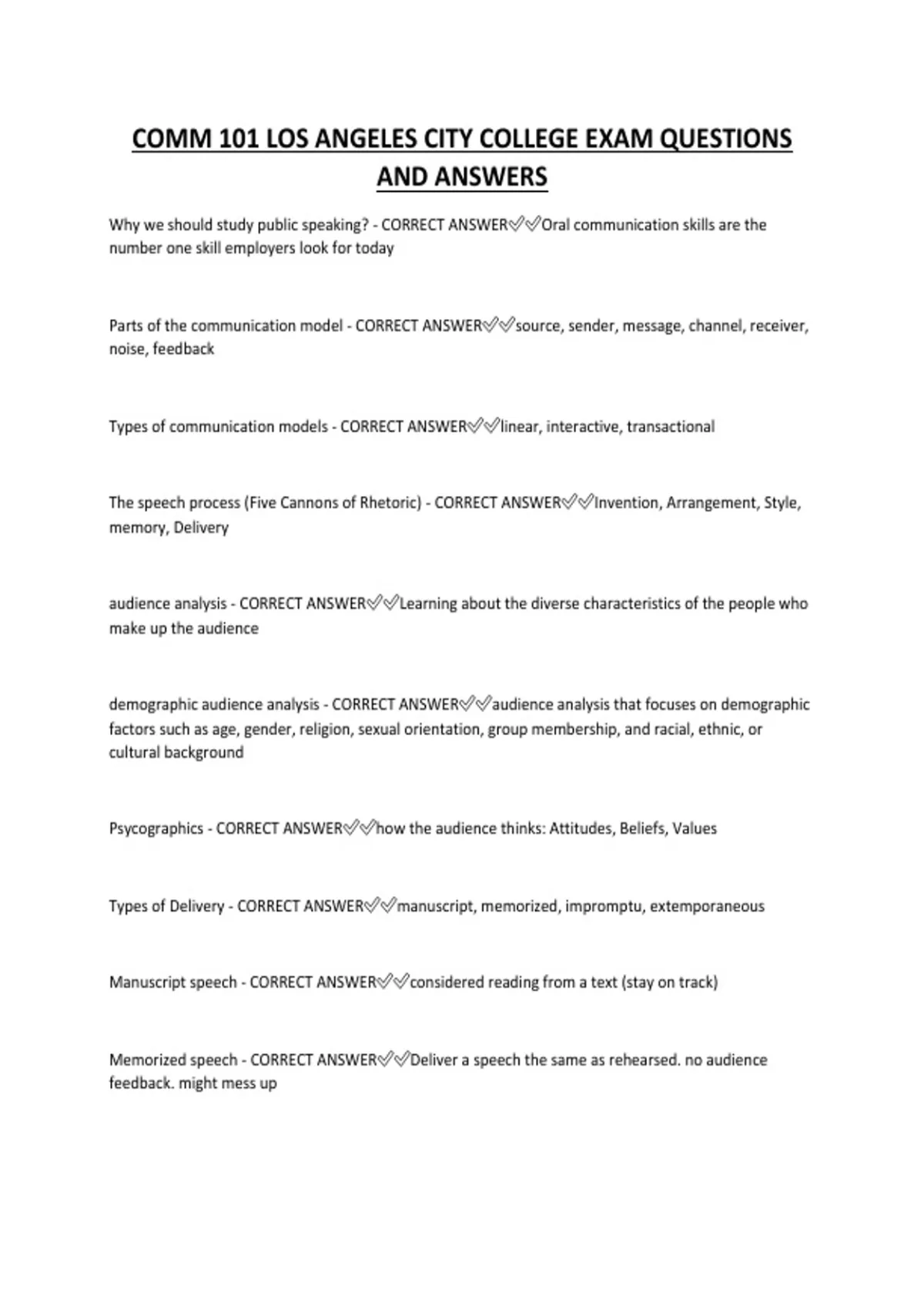 COMM 101 LOS ANGELES CITY COLLEGE EXAM QUESTIONS AND ANSWERS Why we should study public speaking? - CORRECT ANSWEROral communication skills are the number one skill employers look for today