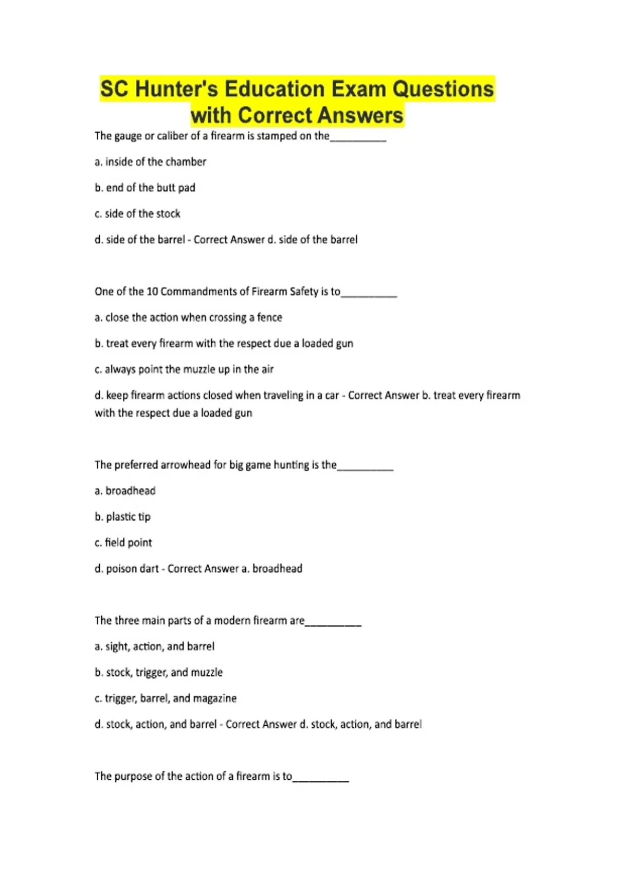 SC Hunter's Education Exam Questions with Correct Answers The gauge or caliber of a firearm is stamped on the__________ a. inside of the chamber b. end of the butt pad c. side of the stock d. side of the barrel - Correct Answer d. side of the barrel One of the 10 Commandments of Firearm Safety is to__________ a. close the action when crossing a fence b. treat every firearm with the respect due a loaded gun c. always point the muzzle up in the air d. keep firearm actions closed when traveling in a car - Correct Answer b. treat every firearm with the respect due a loaded gun The preferred arrowhead for big game hunting is the__________ a. broadhead b. plastic tip c. field point d. poison dart - Correct Answer a. broadhead The three main parts of a modern firearm are__________ a. sight, action, and barrel b. stock, trigger, and muzzle c. trigger, barrel, and magazine d. stock, action, and barrel - Correct Answer d. stock, action, and barrel The purpose of the action of a firearm is to__________ a. help control