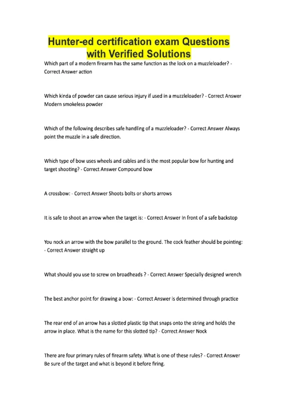 Hunter-ed certification exam Questions with Verified Solutions Which part of a modern firearm has the same function as the lock on a muzzleloader? - Correct Answer action Which kinda of powder can cause serious injury if used in a muzzleloader? - Correct Answer Modern smokeless powder Which of the following describes safe handling of a muzzleloader? - Correct Answer Always point the muzzle in a safe direction. Which type of bow uses wheels and cables and is the most popular bow for hunting and target shooting? - Correct Answer Compound bow A crossbow: - Correct Answer Shoots bolts or shorts arrows It is safe to shoot an arrow when the target is: - Correct Answer In front of a safe backstop You nock an arrow with the bow parallel to the ground. The cock feather should be pointing: - Correct Answer straight up What should you use to screw on broadheads ? - Correct Answer Specially designed wrench The best anchor point for drawing a bow: - Correct Answer is determined through practice The rear end of an arrow has a slotted plastic tip that snaps onto the string and holds the arrow in place. What is the name for this slotted tip? - Correct Answer Nock There are four primary rules of firearm safety. What is one of these rules? - Correct Answer Be sure of t