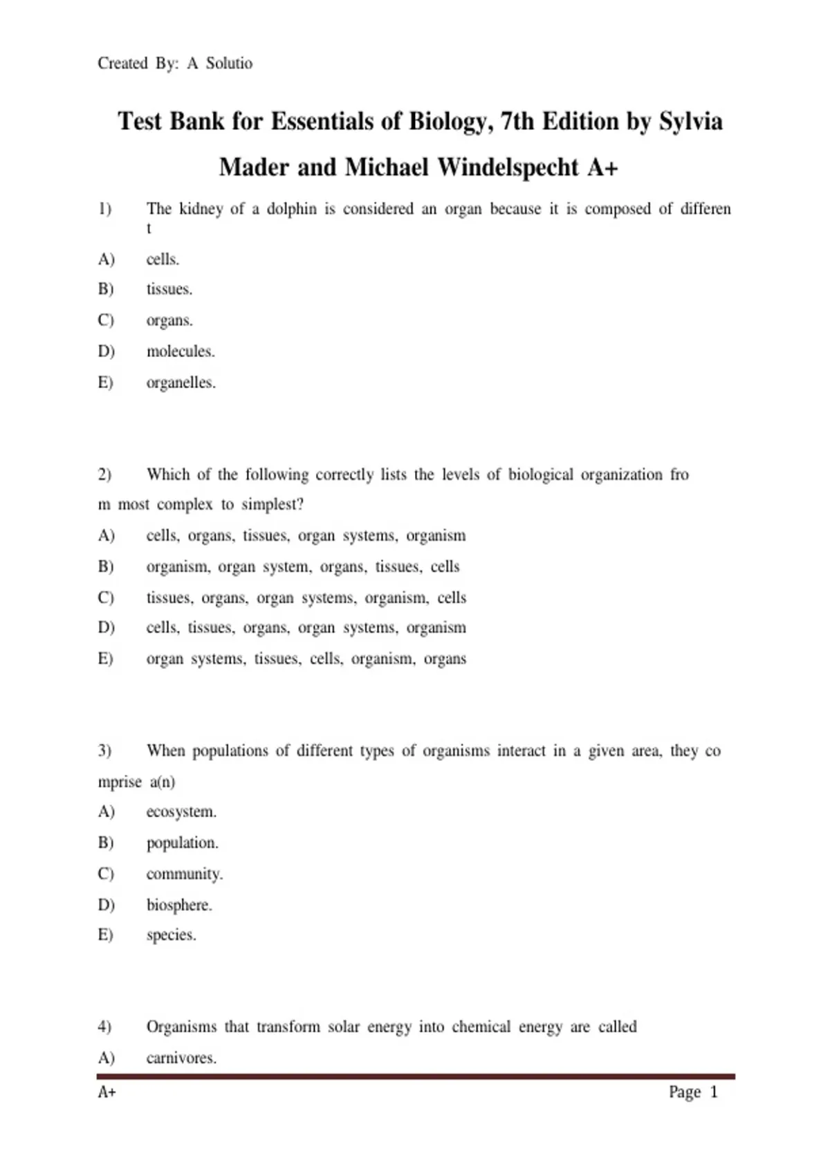 Test Bank for Essentials of Biology, 7th Edition by Sylvia
