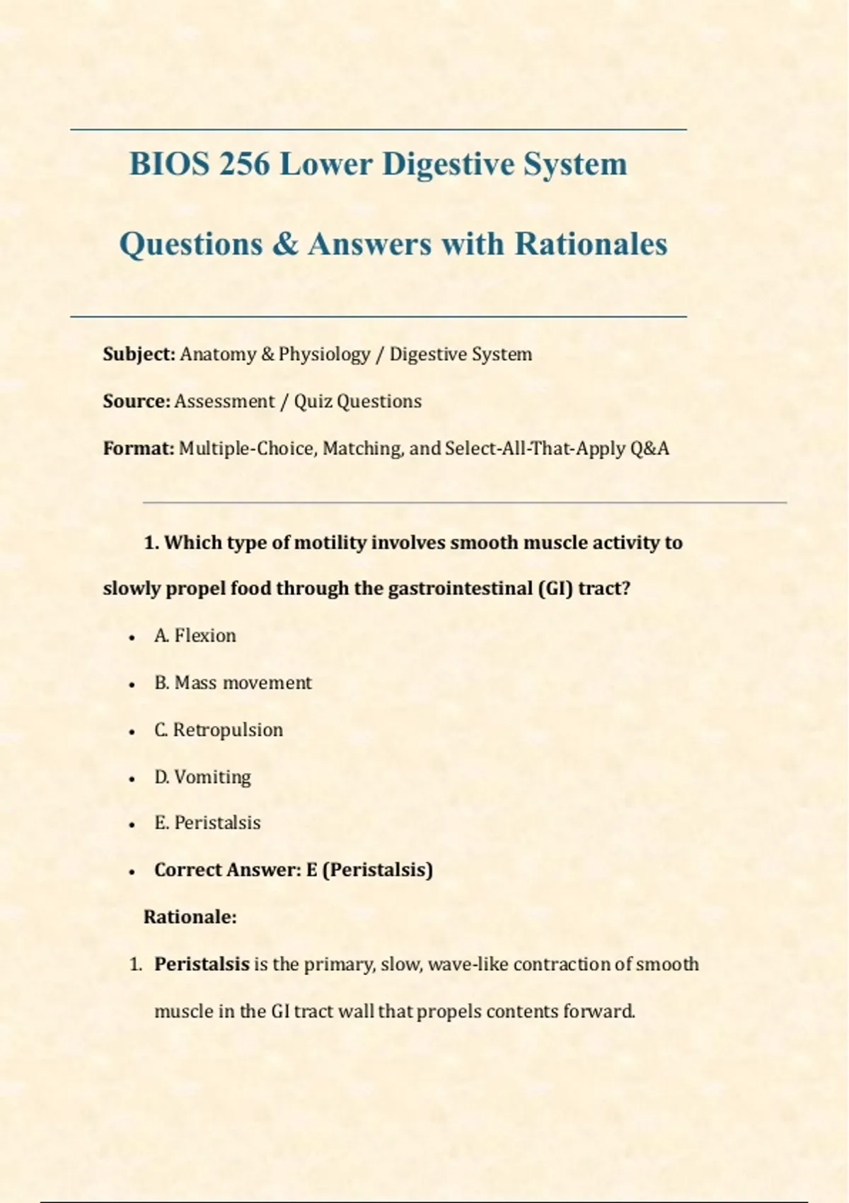 Master the lower digestive system in BIOS 256 (Anatomy & Physiology 4) with this comprehensive Q&A guide including detailed rationales. Covers small intestine, large intestine, rectum, anus, accessory organs (liver, pancreas, gallbladder), nutrient absorption, water and electrolyte balance, digestive enzymes, and clinical correlations. Ideal for BIO 256 students, nursing, or pre-health programs, this guide supports exam preparation, focused review, and mastery of digestive system physiology.