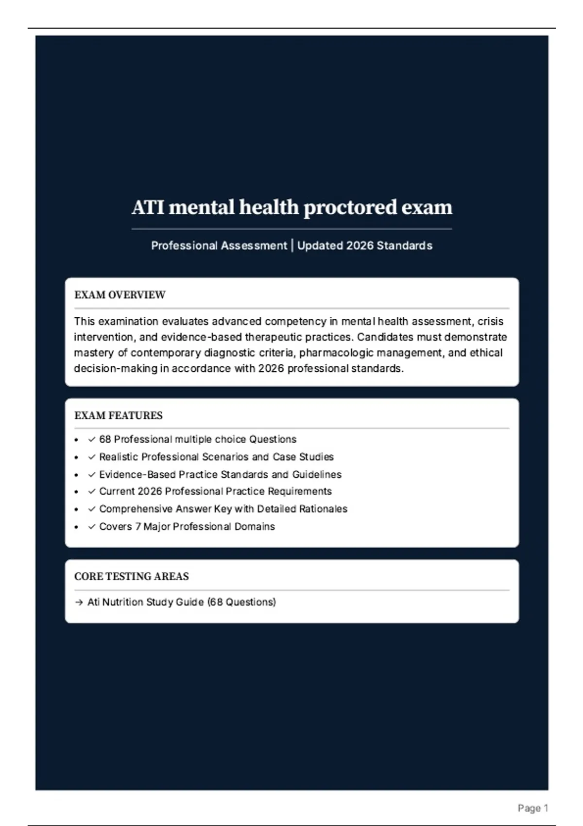 This document provides over 120 fully verified questions and answers for NR 228 Nutrition Exam 1, updated for the 2025–2026 edition. It covers foundational nutrition concepts, including MyPlate themes, macronutrients, micronutrients, digestion, metabolism, energy balance, minerals, vitamins, water balance, and dietary standards. Content is structured in a clear Q&A format to support efficient studying and high‑accuracy exam preparation.