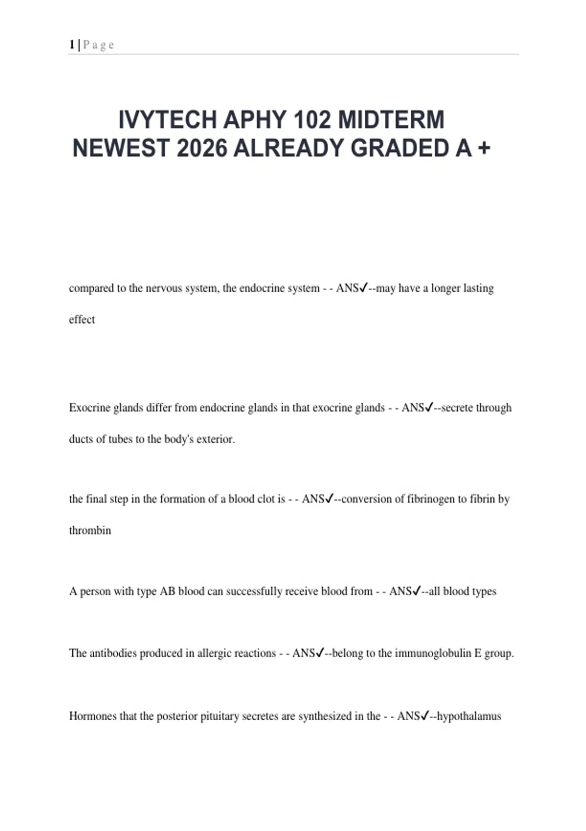 IVYTECH APHY 102 MIDTERM NEWEST 2026 ALREADY GRADED A +