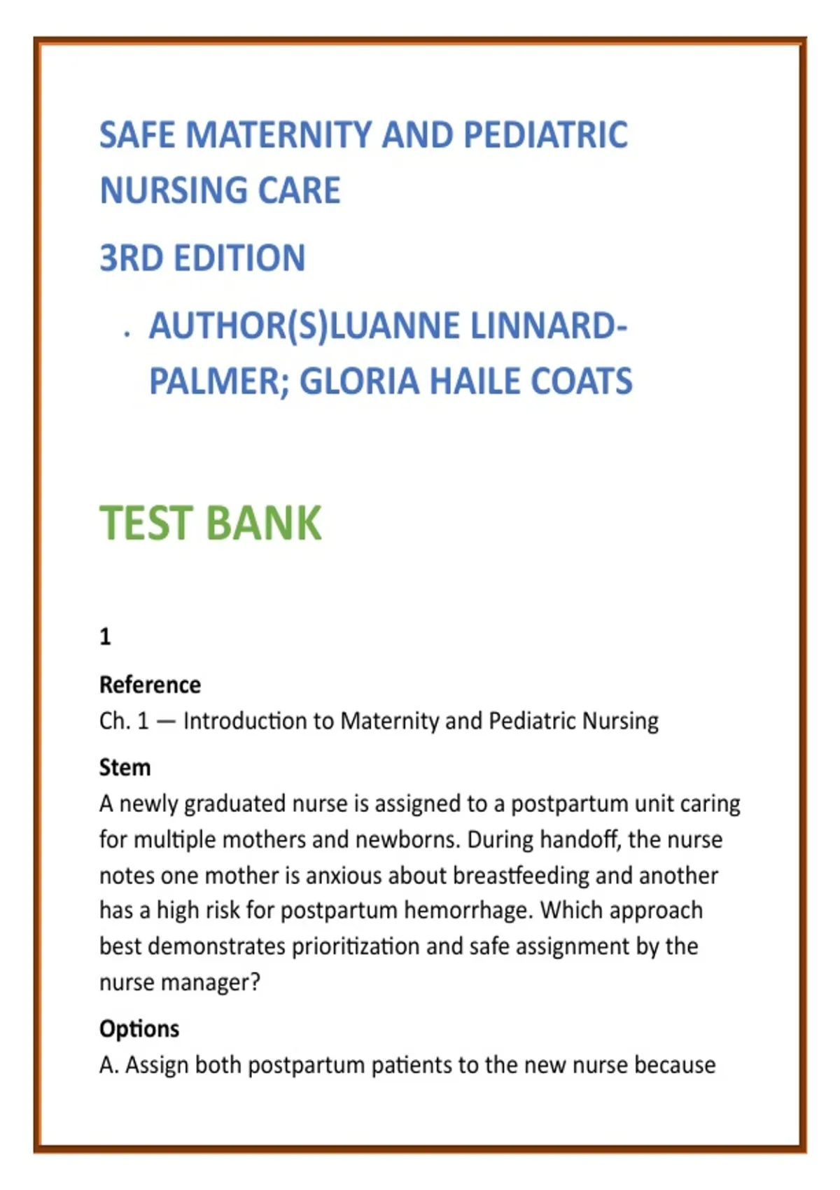 Safe Maternity and Pediatric Nursing Care 3rd Ed Test Bank | Nursing Test Bank 2026 | Maternal-Child & Pediatric NCLEX MCQs 2) SEO Product Description (200–300 words) Master maternal–child and pediatric nursing with this comprehensive Safe Maternity and Pediatric Nursing Care Test Bank (3rd Edition) by Luanne Linnard-Palmer and Gloria Haile Coats—a trusted, safety-focused core text in undergraduate nursing education. This nursing test bank 2026 delivers FULL textbook coverage of all units and chapters, providing 20 NCLEX-style multiple-choice questions (MCQs) per chapter, each with clear correct answers and evidence-based rationales. Every question is designed to strengthen clinical judgment, risk recognition, patient safety, and age-appropriate nursing interventions across maternity, newborn, infant, and pediatric populations. The test bank emphasizes realistic clinical scenarios that mirror nursing exams and NCLEX-RN® expectations, helping students move beyond memorization to confident application and analysis. Questions target maternal health complications, pediatric care considerations, informed consent, legal and ethical responsibilities, family-centered care, and prevention of adverse events, making this resource ideal for both coursework mastery and licensure preparation. What’s Included: Full-chapter coverage of Safe Maternity and Pediatric Nursing Care, 3rd Edition 20 NCLEX-style MCQs per chapter Detailed rationales grounded in nursing safety principles Clinical reasoning scenarios for maternity and pediatric settings Digital, instant-access format for efficient studying Ideal For: Maternity Nursing courses Pediatric Nursing courses Maternal-Child Health Nursing programs NCLEX-RN® preparation focused on maternal and pediatric care This nursing test bank is a time-saving, confidence-building study solution for students who want to excel in exams while developing safe, competent maternal-child nursing practice. 3) 8 High-Value SEO Keywords Safe Maternity and Pediatric Nursing test bank nursing test bank 2026 maternity nursing test bank pediatric nursing MCQs maternal-child NCLEX questions Linnard-Palmer Coats nursing study guide maternal pediatric nursing exam questions NCLEX maternity pediatric test bank 4) 10 Hashtags #MaternityNursing #PediatricNursing #MaternalChildNursing #NursingTestBank #NCLEXPrep #NursingStudents #PediatricNCLEX #MaternityNCLEX #NursingEducation #ClinicalJudgment