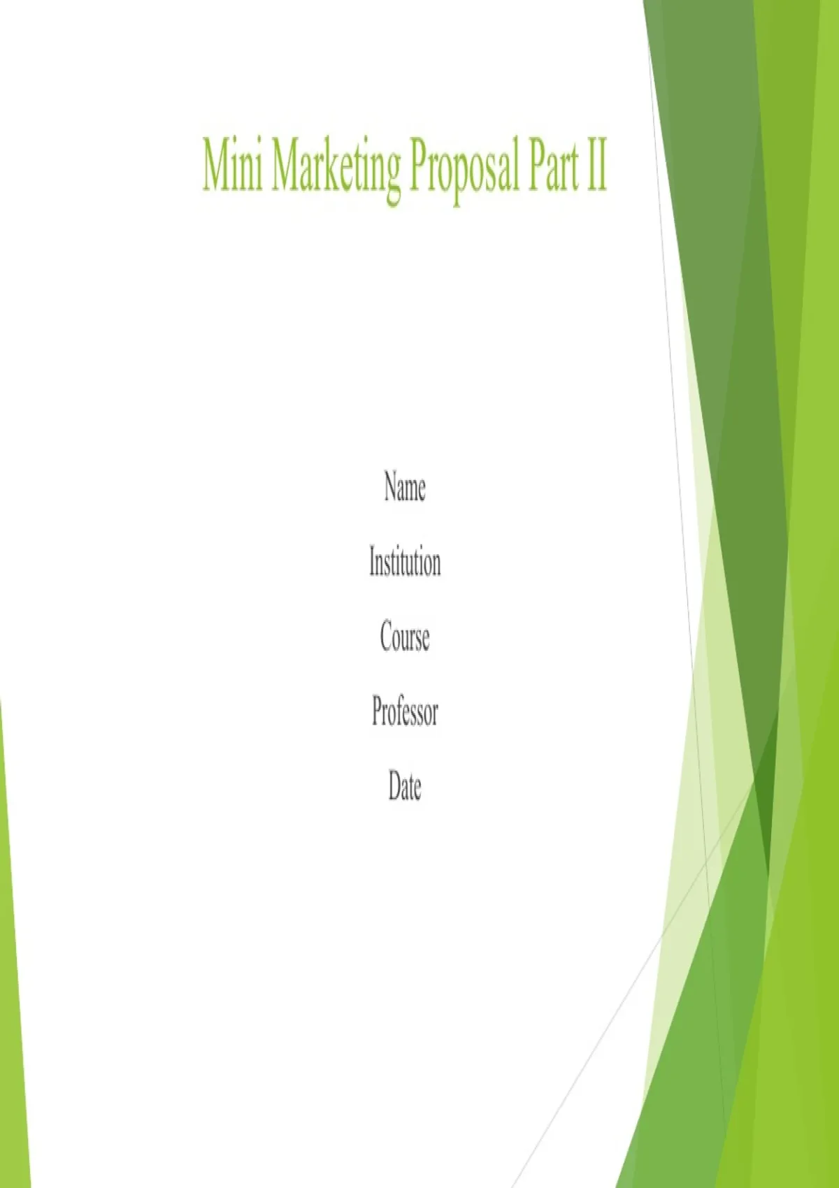 Mini Marketing Proposal Part II Compile a marketing proposal for a new gym opening in your city. Outline ideas for local ads, social media marketing, word of mouth, and potential local celebrity endorsements. Consider the following: What information do you need to obtain from the client? What challenges will you face while working with them? How long of a marketing campaign will you run? Who will you reach out to in your area to help promote the opening? What kind of grand opening will you suggest the client have? A special event? Will you have the client run promotions ahead of the opening? The requirements below must be met for your paper to be accepted and graded: Write a response between 750 – 1000 words for the body of the essay (The title page, abstract, conclusion, and References section are not counted toward the word requirement.) (approximately 4-6 pages) using Microsoft Word in APA style. Address all parts of the mini-project fully. Present the Marketing Proposal in a 10-slide PowerPoint presentation with voice recording (Consider this an Elevator Pitch). Submit the PowerPoint presentation together with the traditional paper. Use font size 12 and 1” margins. Use at least three references from outside the course material (You may use the academic resources included in Week 8) one reference must be from credible resources. The course textbook and lectures can be used, but are not counted toward the three-reference requirement. References must come from sources such as academic and scholarly journals and essays found in Grantham Online Library, CNN, online newspapers such as The Wall Street Journal, government websites, etc. Sources such as Wikis, Yahoo Answers, eHow, blogs, etc. are not acceptable for academic writing. Cite all reference material (data, dates, graphs, quotes, paraphrased words, values, etc.) in the paper and list it on a reference page in APA style. Provide citations everywhere information from the sources is used for foundational support and for validation of opinions. Use the third-person narrative and avoid the use of the first- and second-person narrative and terms such as; I, me, myself, you, your, yourself, we or us (or related forms such as let’s (let us) or we’ll, we’ve (we will / we have) among others). This will prevent the author or other parties from becoming the subject matter and will maintain the focus of the paper on the central theme and subject matter found in the elements. Be informational and avoid being conversational. A detailed explanation of how to cite a source using APA can be found here (Purdue Owl APA Citation Instructions) W8D2 EOC SurveyW8D2 EOC Survey