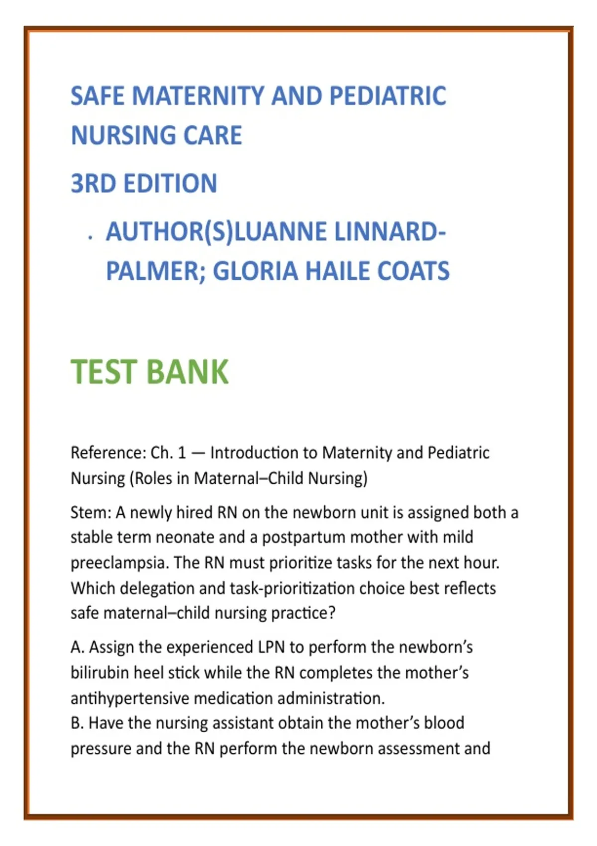 Safe Maternity and Pediatric Nursing Care 3rd Ed Nursing Test Bank 2026 | Linnard-Palmer Coats Nursing Test Bank (≈137 characters) 2) SEO Product Description (200–300 words) Master maternal–child nursing with confidence using the Safe Maternity and Pediatric Nursing Care, 3rd Edition Nursing Test Bank by Luanne Linnard-Palmer and Gloria Haile Coats. This comprehensive nursing test bank 2026 is designed to support nursing students who need clinically accurate, safety-focused, NCLEX-style practice aligned with one of the most trusted maternal–child nursing textbooks. This digital Safe Maternity and Pediatric Nursing test bank provides full textbook coverage of every unit and chapter, with 20 high-quality NCLEX-style MCQs per chapter, each paired with clear, evidence-based rationales. Questions emphasize clinical judgment, patient safety, developmental considerations, family-centered care, and risk reduction across maternity and pediatric settings. Whether you are enrolled in Maternity Nursing, Pediatric Nursing, or Maternal–Child Health Nursing, this test bank helps you efficiently reinforce core concepts, identify knowledge gaps, and strengthen exam readiness. Each question is written at the application and analysis level to mirror real-world nursing decisions and NCLEX expectations. What’s included: Full coverage of Safe Maternity and Pediatric Nursing Care (3rd Edition) 20 NCLEX-style MCQs per chapter Detailed rationales explaining correct and incorrect options Clinical reasoning scenarios for maternal and pediatric care Focus on safety, prioritization, and prevention of adverse events Digital format for fast, flexible study anywhere This Linnard-Palmer Coats nursing study guide is ideal for students preparing for course exams, ATI/HESI-style assessments, and NCLEX-RN® maternal-child questions, delivering focused practice that builds competence and confidence. 3) 8 High-Value SEO Keywords Safe Maternity and Pediatric Nursing test bank nursing test bank 2026 maternity nursing test bank pediatric nursing MCQs maternal-child NCLEX questions Linnard-Palmer Coats nursing study guide maternal pediatric nursing exam questions nursing school maternity pediatric test bank 4) 10 Hashtags #MaternalChildNursing #PediatricNursing #MaternityNursing #NursingTestBank #NCLEXPrep #NursingStudents #NursingSchoolStudy #MaternalChildNCLEX #PediatricNursingMCQs #NursingExamPrep