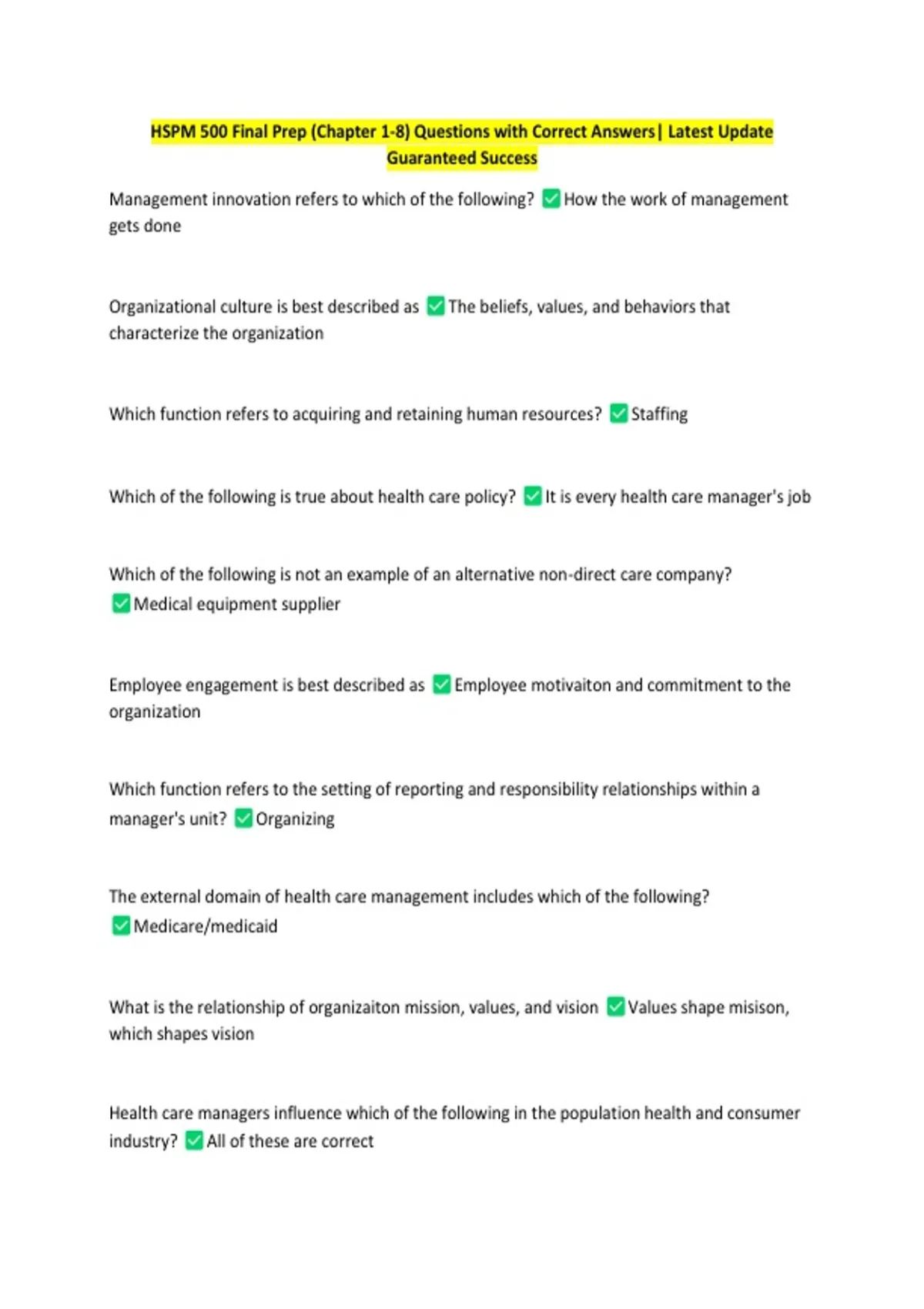 HSPM 500 Final Prep (Chapter 1-8) Questions with Correct Answers| Latest Update