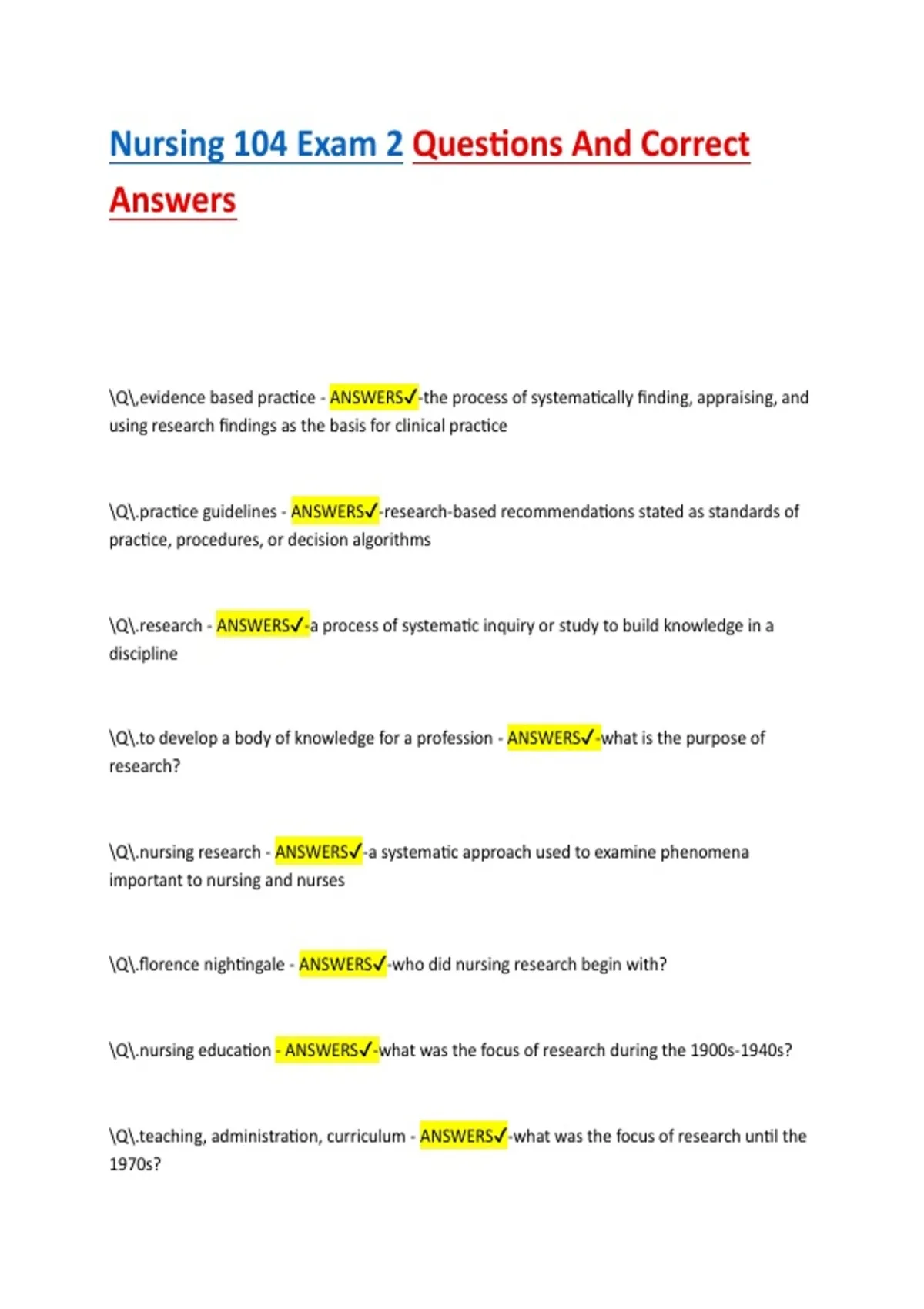Nursing 104 Exam 2 Questions And Correct Answers Q,evidence based practice - ANSWERS-the process of systematically finding, appraising, and using research findings as the basis for clinical practice Q.practice guidelines - ANSWERS-research-based recommendations stated as standards of practice, procedures, or decision algorithms Q.research - ANSWERS-a process of systematic inquiry or study to build knowledge in a discipline Q.to develop a body of knowledge for a profession - ANSWERS-what is the purpose of research? Q.nursing research - ANSWERS-a systematic approach used to examine phenomena important to nursing and nurses Q.florence nightingale - ANSWERS-who did nursing research begin with? Q.nursing education - ANSWERS-what was the focus of research during the 1900s-1940s? Q.teaching, administration, curriculum - ANSWERS-what was the focus of research until the 1970s? Q.improvement of patient care - ANSWERS-what was the focus of research during the 1970s? Q.to provide high quality care to individuals - ANSWERS-why does nursing exist? Q.to put the knowledge gained to work in health care - ANSWERS-what is the main outcome of research activity for nurses? Q.federal funding, private foundations, nursing organizations - ANSWERS-what are the 3 types of funding for nursing research? Q.national institute of nursing research (NINR) and agency for healthcare research and quality (AHRQ) - ANSWERS-what are the 2 sources of federal funding? Q.national institute of nursing research (NINR) - ANSWERS-symptom science, wellness, self-management, end of life and palliative care Q.NINR innovative question initiative - ANSWERS-launched to encourage new thinking and creativity in nursing to promote results-oriented innovations Q.agency for healthcare research and quality (AHRQ) - ANSWERS-improve health care outcomes, reduce the risk of harm, transform research into practice, promote use of EBP, advanced use of information technology for coordinating patient care and conducting quality and outcomes research, include priority populations health care needs in their research Q.robert wood johnson foundation and w.k. kellogg foundation - ANSWERS-what are the 2 private foundations that provide research funding? Q.sigma theta tau international (STTI), american nurses association (ANA), oncology nurses society (ONS), american nurses foundation (ANF) - ANSWERS-what are the 3 nursing organizations that provide research funding? Q.sigma theta tau international (STTI) - ANSWERS-makes research grant awards to increase scientific knowledge related to nursing practice; supports creative interdisciplinary research and places important on identifying best practices and benchmark innovations Q.american nurses association (ANA) - ANSWERS-awards small grants through the American Nurses Foundation Q.oncology nurses society (ONS) - ANSWERS-awards grants that focus on issues related to oncology Q.clinicians, students, educators, administrators, and policymakers - ANSWERS-EBP has become a major driving force in the disciplinary life of who? Q.translation science - ANSWERS-extensive work is being done on the best ways to translate research into practice, spawning a new area of health care science; to provide guidance on the best ways to incorporate best evidence into health care Q.clinical nurse specialist (CNS), clinical nurse researcher (CNR), clinical nurse leader (CNL), doctor of nursing practice (DNP) - ANSWERS-what are the 4 nursing research roles? Q.clinical nurse specialist (CNS) - ANSWERS-registered nurse with graduate preparation in a specialized area of nursing practice and an expert clinician with additional responsibility for education and research