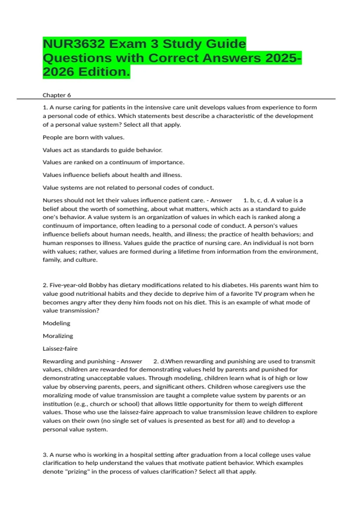 Chapter 6 1. A nurse caring for patients in the intensive care unit develops values from experience to form a personal code of ethics. Which statements best describe a characteristic of the development of a personal value system? Select all that apply. People are born with values. Values act as standards to guide behavior. Values are ranked on a continuum of importance. Values influence beliefs about health and illness. Value systems are not related to personal codes of conduct. Nurses should not let their values influence patient care. - Answer 1. b, c, d. A value is a belief about the worth of something, about what matters, which acts as a standard to guide one's behavior. A value system is an organization of values in which each is ranked along a continuum of importance, often leading to a personal code of conduct. A person's values influence beliefs about human needs, health, and illness; the practice of health behaviors; and human responses to illness. Values guide the practice of nursing care. An individual is not born with values; rather, values are formed during a lifetime from information from the environment, family, and culture. 2. Five-year-old Bobby has dietary modifications related to his diabetes. His parents want him to value good nutritional habits and they decide to deprive him of a favorite TV program when he becomes angry after they deny him foods not on his diet. This is an example of what mode of value transmission? Modeling Moralizing Laissez-faire Rewarding and punishing - Answer 2. d.When rewarding and punishing are used to transmit values, children are rewarded for demonstrating values held by parents and punished for demonstrating unacceptable values. Through modeling, children learn what is of high or low value by observing parents, peers, and significant others. Children whose caregivers use the moralizing mode of value transmission are taught a complete value system by parents or an institution (e.g., church or school) that allows little opportunity for them to weigh different values. Those who use the laissez-faire approach to value transmission leave children to explore values on their own (no single set of values is presented as best for all) and to develop a personal value system.