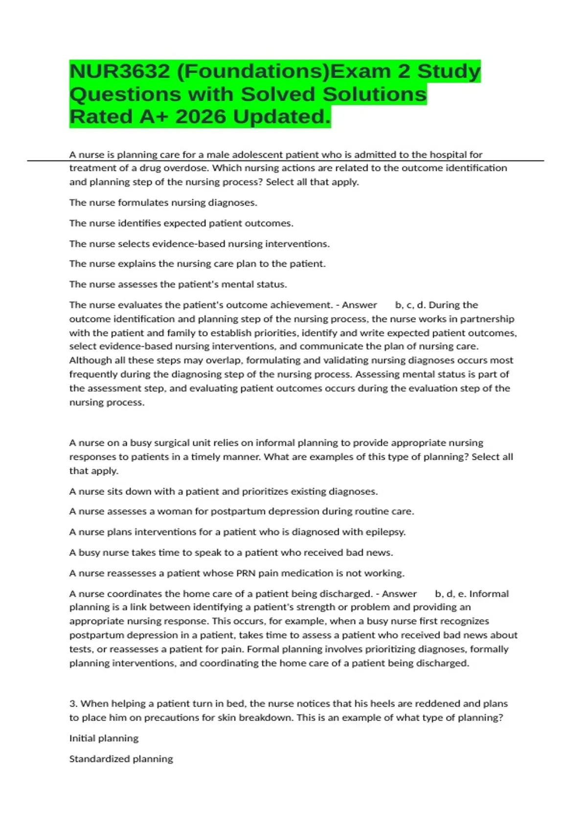 3. When helping a patient turn in bed, the nurse notices that his heels are reddened and plans