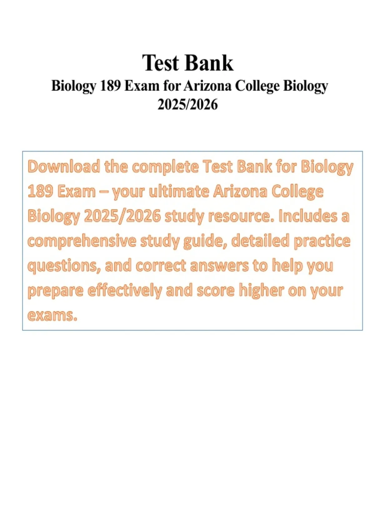 Comprehensive test bank for Biology 189 exams. Includes verified questions and answers covering key biology concepts, cell biology, genetics, physiology, and laboratory topics for thorough exam preparation.