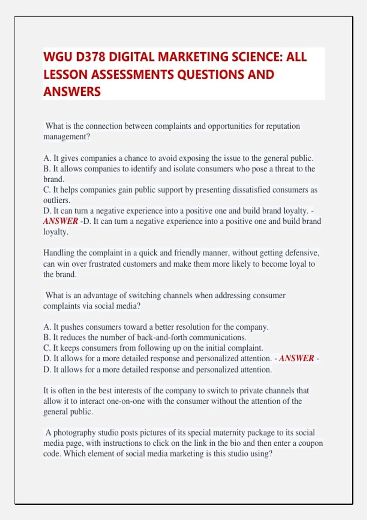 WGU D378 DIGITAL MARKETING SCIENCE: ALL LESSON ASSESSMENTS QUESTIONS AND ANSWERS