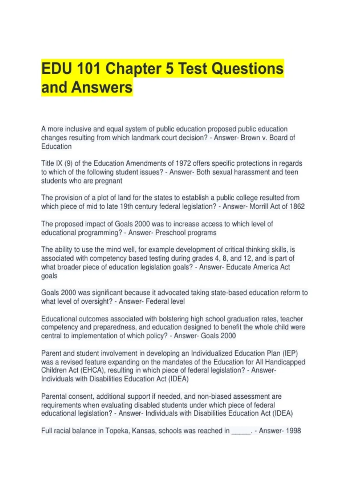 educational legislation? - Answer- Individuals with Disabilities Education Act (IDEA)