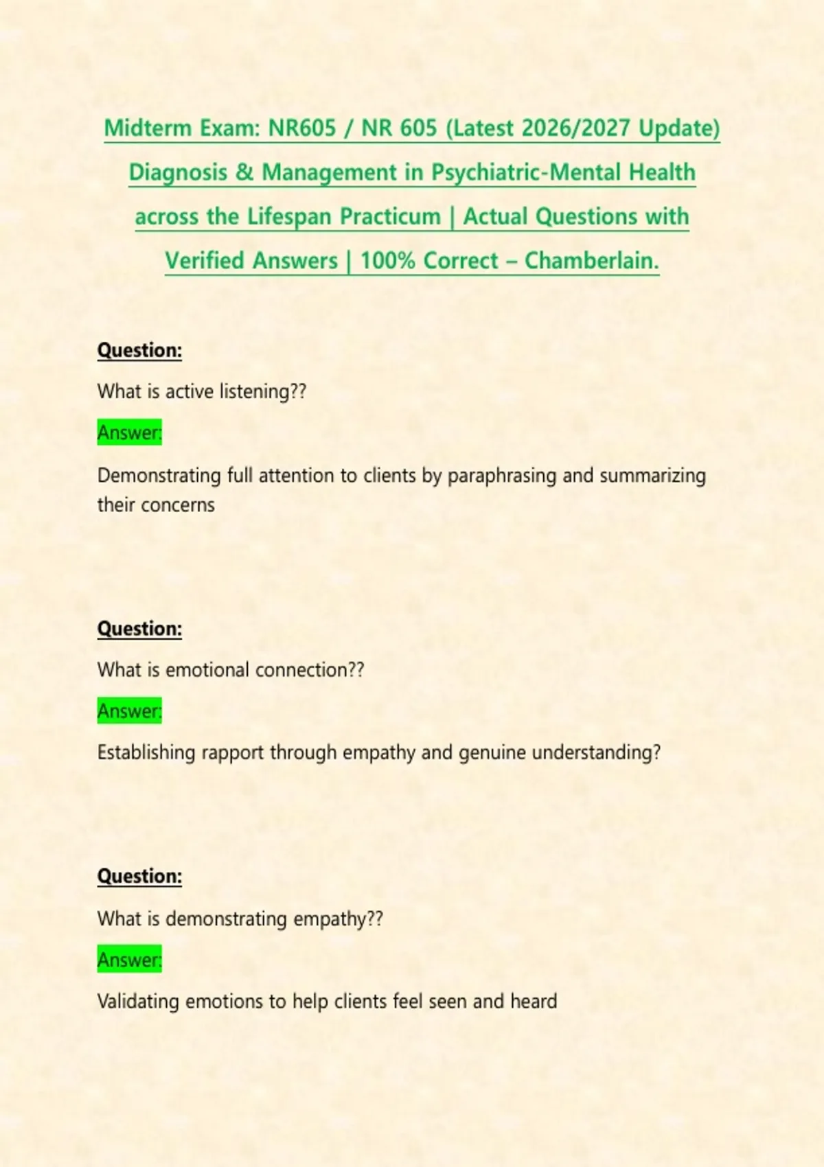 Midterm Exam: NR605 / NR 605 (Latest 2026/2027 Update) Diagnosis & Management in Psychiatric-Mental Health across the Lifespan Practicum | Actual Questions with Verified Answers | 100% Correct – Chamberlain.