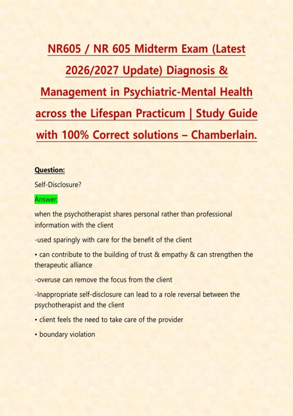 NR605 / NR 605 Midterm Exam (Latest 2026/2027 Update) Diagnosis & Management in Psychiatric-Mental Health across the Lifespan Practicum | Study Guide with 100% Correct solutions – Chamberlain.