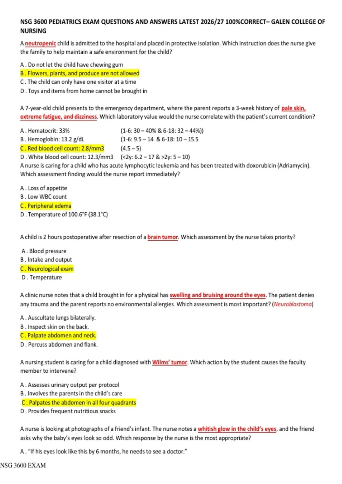 NSG 3600 PEDIATRICS EXAM QUESTIONS AND ANSWERS LATEST 2026/27 100%CORRECT– GALEN COLLEGE OF NURSING