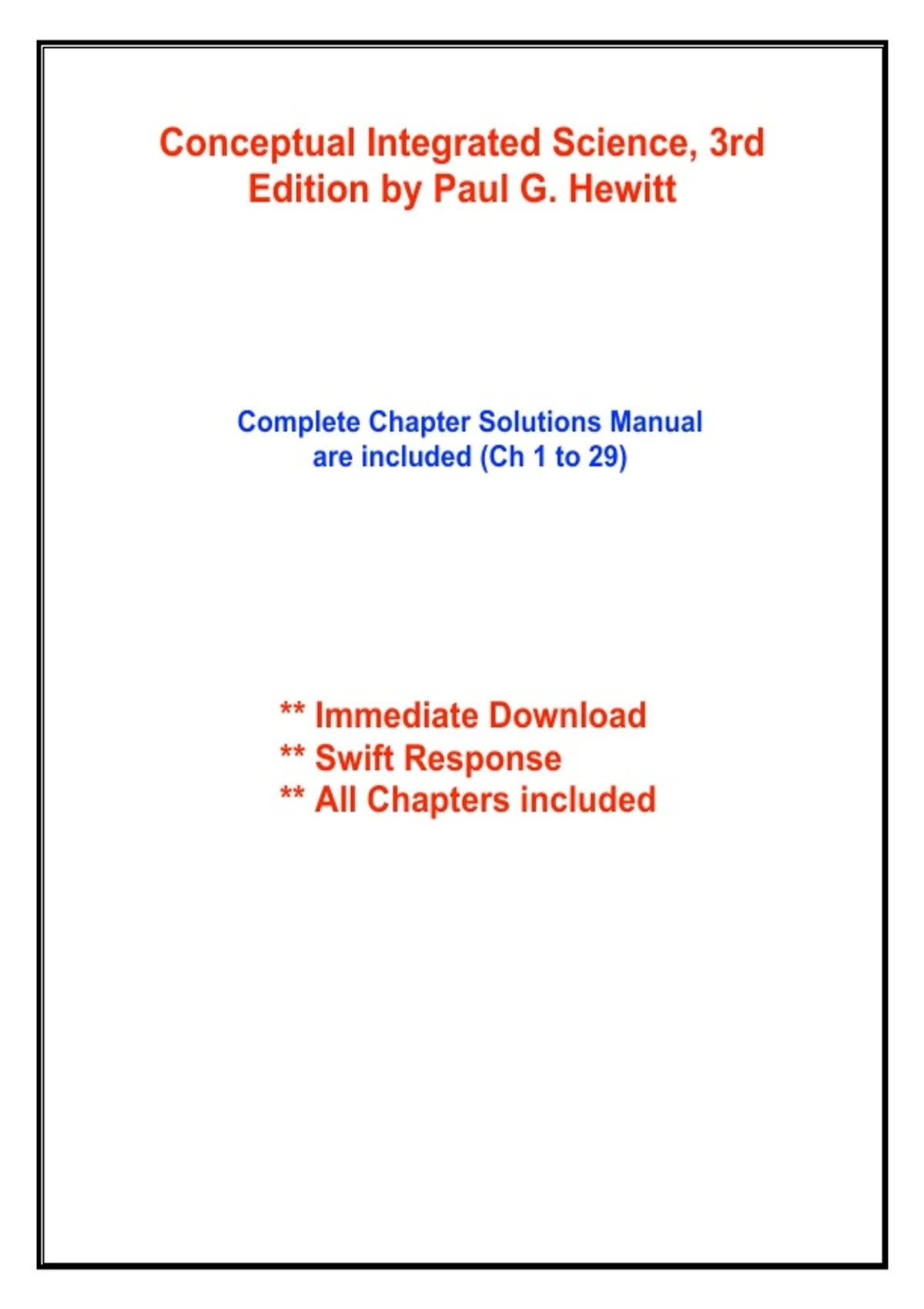 Complete Solutions Manual for Conceptual Integrated Science, 3rd Edition by Paul G. Hewitt, Suzanne A Lyons ; ISBN13: 9780135626573...(Full Chapters included from Chapter 1 to 29)...1. About Science 2. Describing Motion 3. Newton's Laws of Motion 4. Momentum and Energy 5. Gravity 6. Heat 7. Electricity and Magnetism 8. Waves: Sound and Light 9. Atoms and the Periodic Table 10. The Atomic Nucleus and Radioactivity 11. Investigating Matter 12. Chemical Bonds and Mixtures 13. Chemical Reactions 14. Organic Chemistry 15. The Basic Unit of Life: The Cell 16. Genetics 17. The Evolution of Life 18. Diversity of Life on Earth 19. Human Biology I: Control and Development 20. Human Biology II: Care and Maintenance 21. Ecology 22. Plate Tectonics: The Earth System 23. Rocks and Minerals 24. Earth's Surface: Land and Water 25. Surface Processes 26. Weather and Climate 27. Environmental Geology 28. The Solar System 29. The Universe