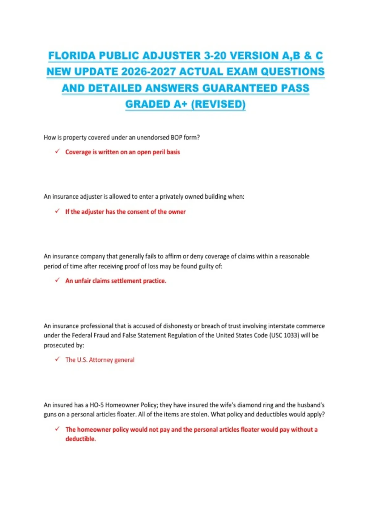 This document includes the newly updated Florida Public Adjuster 3-20 exam questions for versions A, B, and C, aligned with the 2026–2027 exam outline. It provides actual exam-style questions with detailed, step-by-step answers covering Florida insurance law, adjuster responsibilities, ethics, policy analysis, and claims procedures. The material is revised for accuracy and designed for thorough exam preparation and high-scoring results.