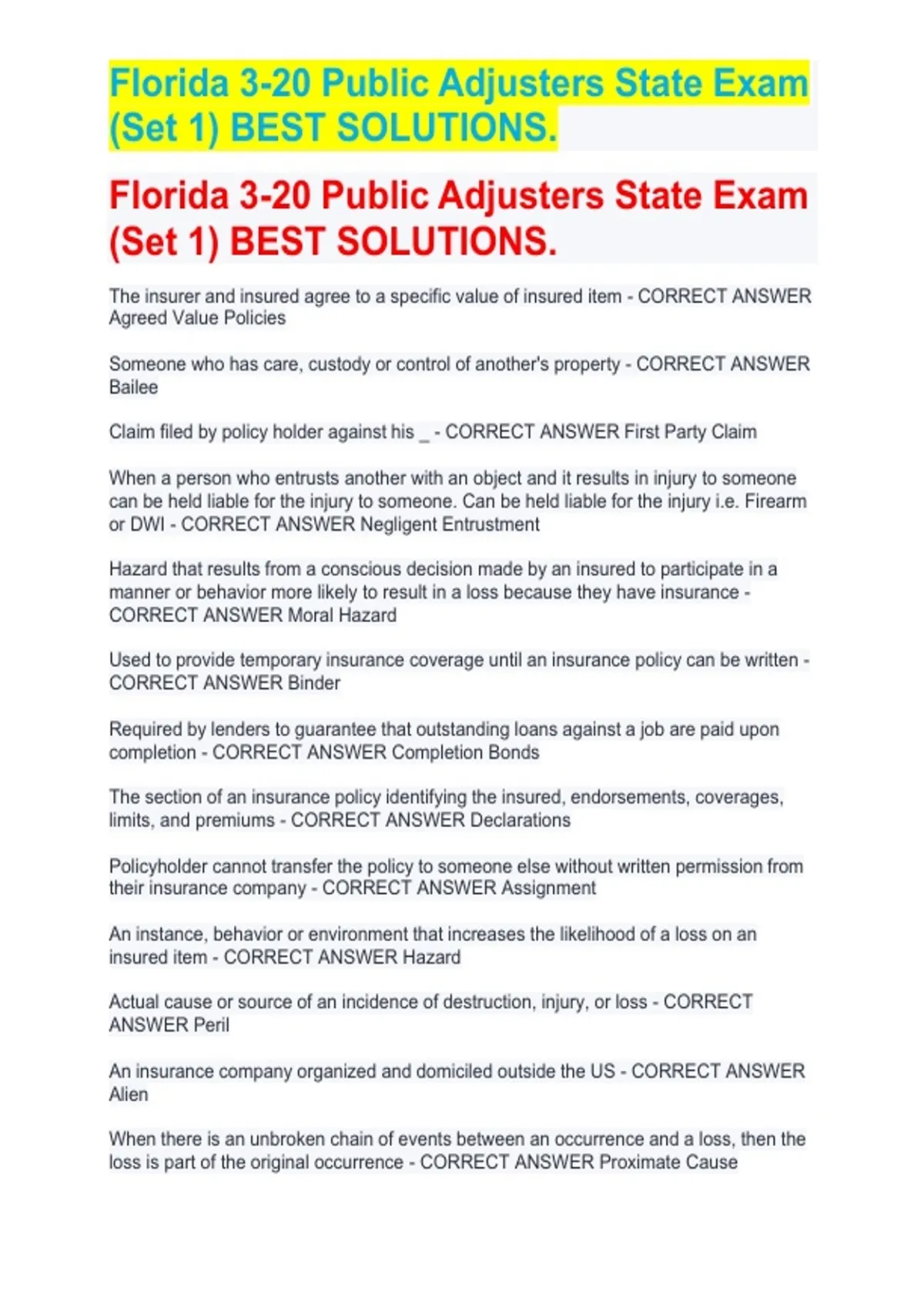 This document contains Set 1 of the Florida 3-20 Public Adjuster State Exam, featuring carefully selected practice questions with clear and accurate solutions. It covers core exam topics such as Florida insurance statutes, public adjuster duties, ethical requirements, policy provisions, and claims handling procedures. The content is structured to support effective study and confident exam preparation.