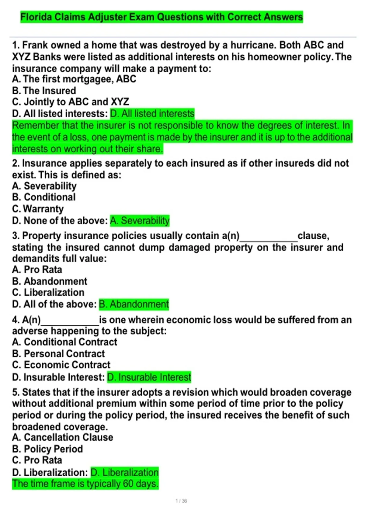 , Florida Claims Adjuster Exam Questions with Correct Answers