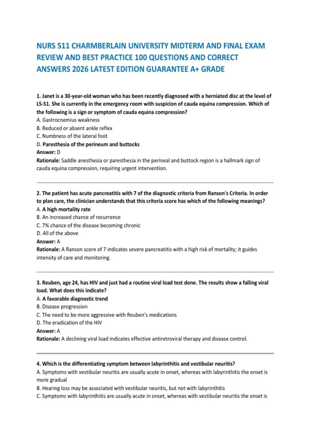 Prepare to excel in NURS 511 with this comprehensive 2026 edition review guide featuring 100 carefully curated practice questions and correct answers aligned with Chamberlain University’s exam objectives. Designed for both the midterm and final exams, this resource reinforces key nursing concepts, clinical reasoning, and test‑taking strategies. It includes detailed rationales and best practices to strengthen your understanding, build confidence, and help you achieve a guaranteed A+ grade. Ideal for self‑study, group review, and final preparation before test day.