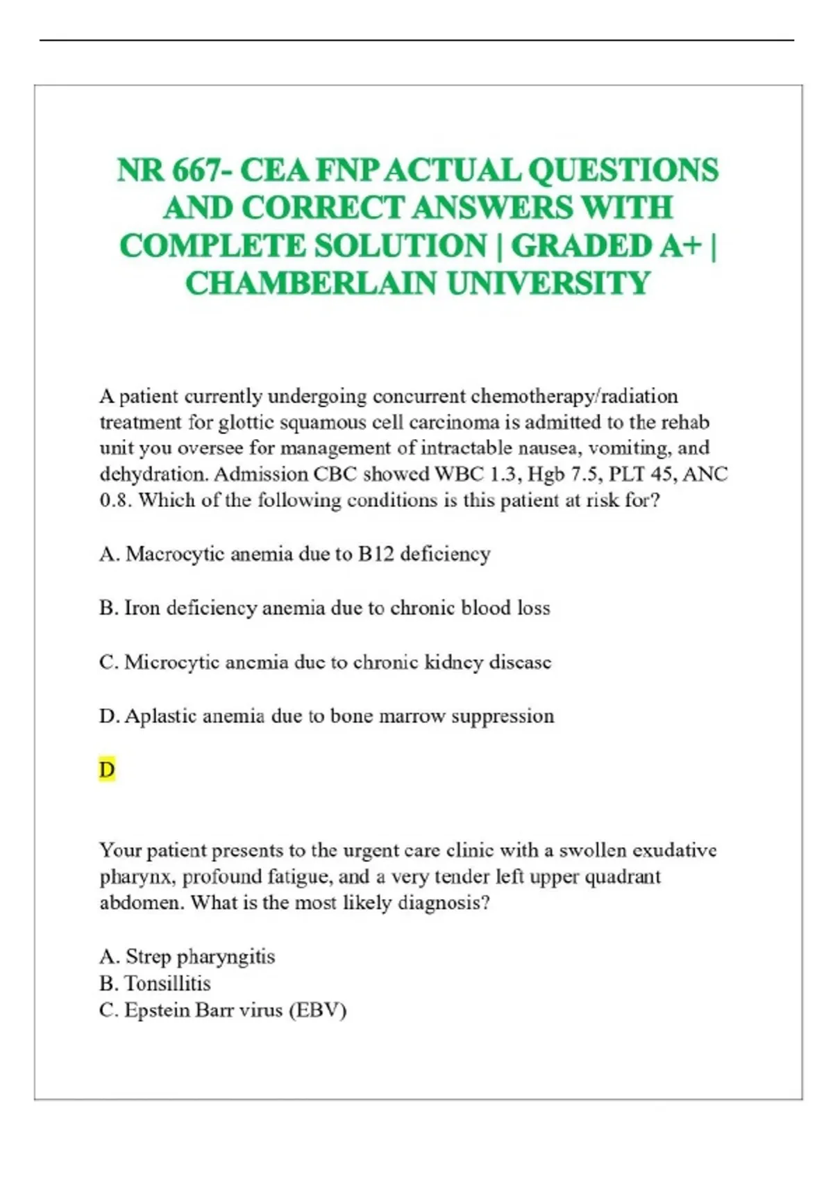 NR 667- CEA FNP ACTUAL QUESTIONS AND CORRECT ANSWERS WITH COMPLETE SOLUTION | GRADED A+ | CHAMBERLAIN UNIVERSITY