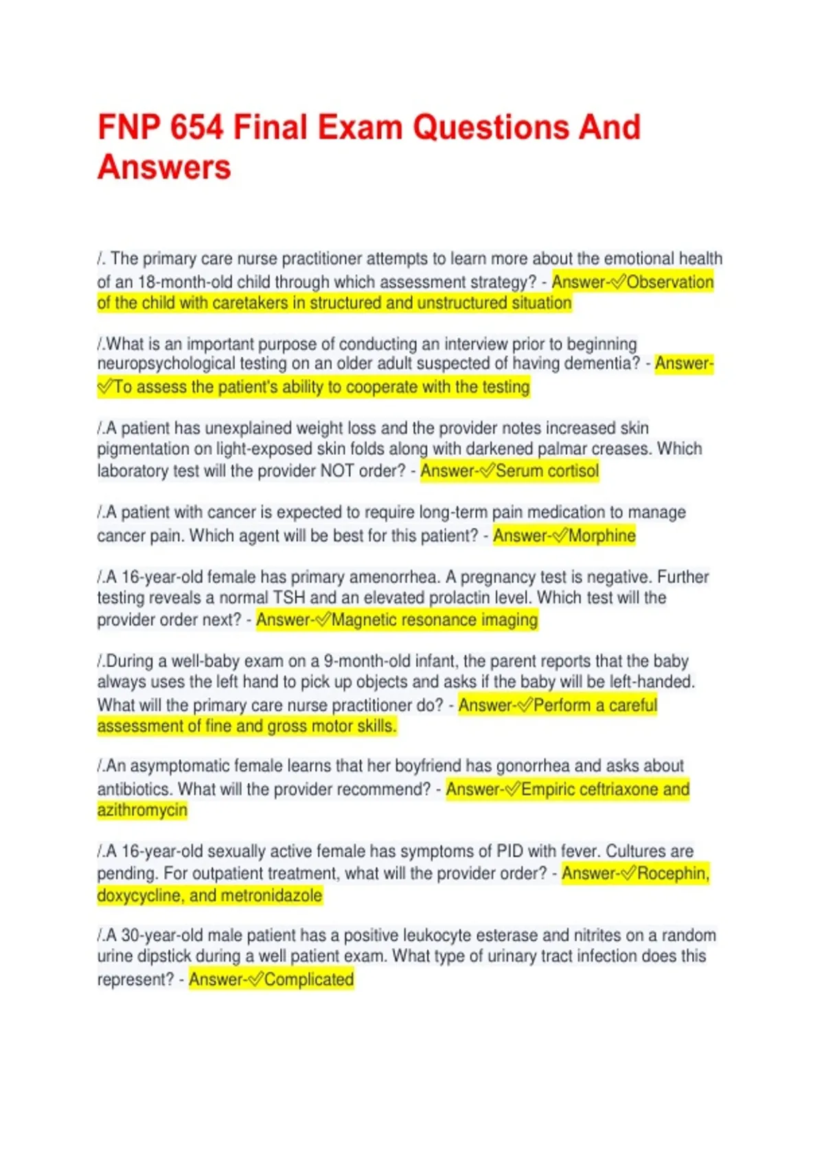 FNP 654 Final Exam Questions And Answers /. The primary care nurse practitioner attempts to learn more about the emotional health of an 18-month-old child through which assessment strategy? - Answer-Observation of the child with caretakers in structured and unstructured situation /.What is an important purpose of conducting an interview prior to beginning neuropsychological testing on an older adult suspected of having dementia? - Answer-To assess the patient's ability to cooperate with the testing /.A patient has unexplained weight loss and the provider notes increased skin pigmentation on light-exposed skin folds along with darkened palmar creases. Which laboratory test will the provider NOT order? - Answer-Serum cortisol /.A patient with cancer is expected to require long-term pain medication to manage cancer pain. Which agent will be best for this patient? - Answer-Morphine /.A 16-year-old female has primary amenorrhea. A pregnancy test is negative. Further testing reveals a normal TSH and an elevated prolactin level. Which test will the provider order next? - Answer-Magnetic resonance imaging /.During a well-baby exam on a 9-month-old infant, the parent reports that the baby always uses the left hand to pick up objects and asks if the baby will be left-handed. What will the primary care nurse practitioner do? - Answer-Perform a careful assessment of fine and gross motor skills. /.An asymptomatic female learns that her boyfriend has gonorrhea and asks about antibiotics. What will the provider recommend? - Answer-Empiric ceftriaxone and azithromycin /.A 16-year-old sexually active female has symptoms of PID with fever. Cultures are pending. For outpatient treatment, what will the provider order? - Answer-Rocephin, doxycycline, and metronidazole /.A 30-year-old male patient has a positive leukocyte esterase and nitrites on a random urine dipstick during a well patient exam. What type of urinary tract infection does this represent? - Answer-Complicated /.A woman who has had routine Pap tests all of her adult life has an abnormal Pap with low-grade intraepithelial lesion. What will the provider tell her about this result? - Answer-Colposcopy with biopsy is necessary /.A patient has bone pain and laboratory testing reveals an elevated serum alkaline phosphatase (SAP). Which test can help distinguish Paget's from malignant bone disease? - Answer-Bone radiograph /.What is the most important role of the primary care provider in cancer management? - Answer-Counseling about healthy practices to reduce risk factors /.A 35-year-old woman without a previous history of dysmenorrhea reports lower pelvic pain and irregular bleeding between periods. What is the initial action in managing this patient? - Answer-Performing an abdominal, pelvic, and rectovaginal examination /.A patient being treated for cancer has had chemotherapy within the past two weeks and comes to the primary care clinic with a fever of 38.5° C. What is the initial action? - Answer-Obtain a STAT CBC with differential /.What is a possible cause of decreased arousal, libido, and orgasm in a postmenopausal woman? - Answer-Diminished testosterone /.A middle-school-age child is skipping school frequently and getting poor grades since the child's father was killed while deployed in the military. How will the primary care nurse practitioner manage this situation? - Answer-Refer the child to a mental health specialist for evaluation and treatment. /.A 40-year-old patient with primary hyperparathyroidism has increased serum calcium 0.5 mg/dL above normal without signs of nephrolithiasis. What is the recommended treatment for this patient? - Answer-Annual monitoring of calcium, creatinine, and bone density /.What is true about HPV infection in women? - Answer-Most HPV lesions will resolve spontaneously without causing cancer. /.An elderly patient is diagnosed with osteoporosis. What is the recommended treatment once the diagnosis is made? - Answer-Bisphosphonate therapy /.A postmenopausal woman reports unilateral breast pain that she describes as sharp and burning and localized to one area. A breast examination reveals no dimpling, discharge, or masses. Which diagnostic test will the provider order? - Answer-Bilateral mammography /.An adolescent female has amenorrhea. The provider notes short stature, neck webbing, and a pigeon chest deformity. Based on these symptoms, what is the underlying disorder causing this patient's amenorrhea? - Answer-Turner's syndrome /.A young female has a Pap test which reveals atypical squamous cells of undetermined significance. What will the next step be in managing this patient? - Answer-Repeat cytology in 12 months /.Which drug is used to treat patients with focal epilepsy and complex partial seizures? - Answer-Carbamazepine /.A 35-year-old patient reports suddenly experiencing an asymmetric smile along with drooping and tearing in one eye. The patient has a history of a recent viral illness, but is otherwise healthy. During the exam, the provider notes that there is unilateral full face paralysis on the right side. What is the initial intervention for this patient? - Answer-Prescribe oral prednisolone /.A primary care provider suspects Parkinson's disease (PD) in a 70-year-old patient. Which tests may be performed to diagnose this disorder? - Answer-Presence of 2 cardinal signs which improve with levodopa /.A toddler has begun hitting and biting other children at a day care center and is exhibiting temper tantrums and bad language at home. The parent reports that these behaviors began shortly after a sibling was born. What will the primary care nurse practitioner do? - Answer-Engage the parent in positive parenting strategies to facilitate appropriate child coping. /.A 69-year-old patient with cancer is reluctant to take an opioid agonist medication because of the side effects. What will the primary care provider recommend? - Answer-Taking a stool softener with the opioid /.Which is a risk factor for pelvi