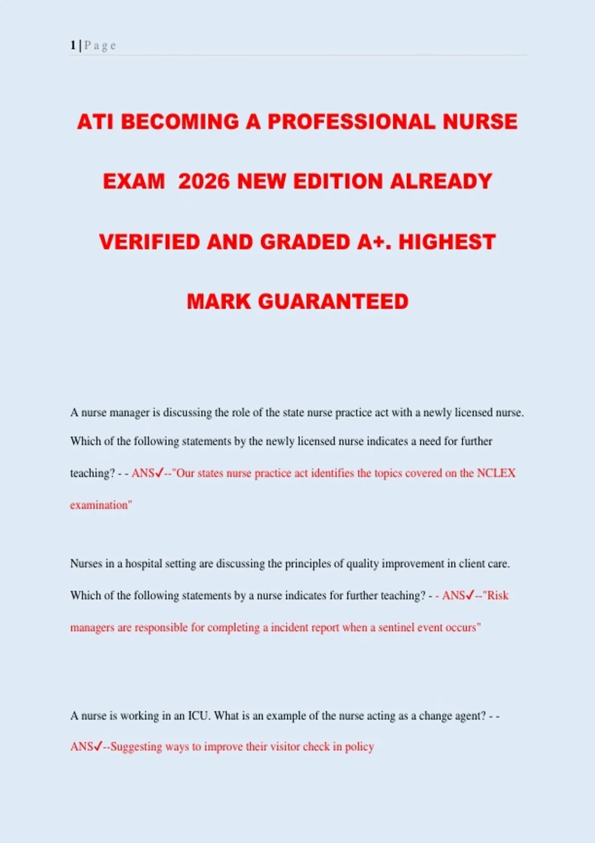 ATI BECOMING A PROFESSIONAL NURSE EXAM 2026 NEW EDITION ALREADY VERIFIED AND GRADED A+. HIGHEST MARK GUARANTEED
