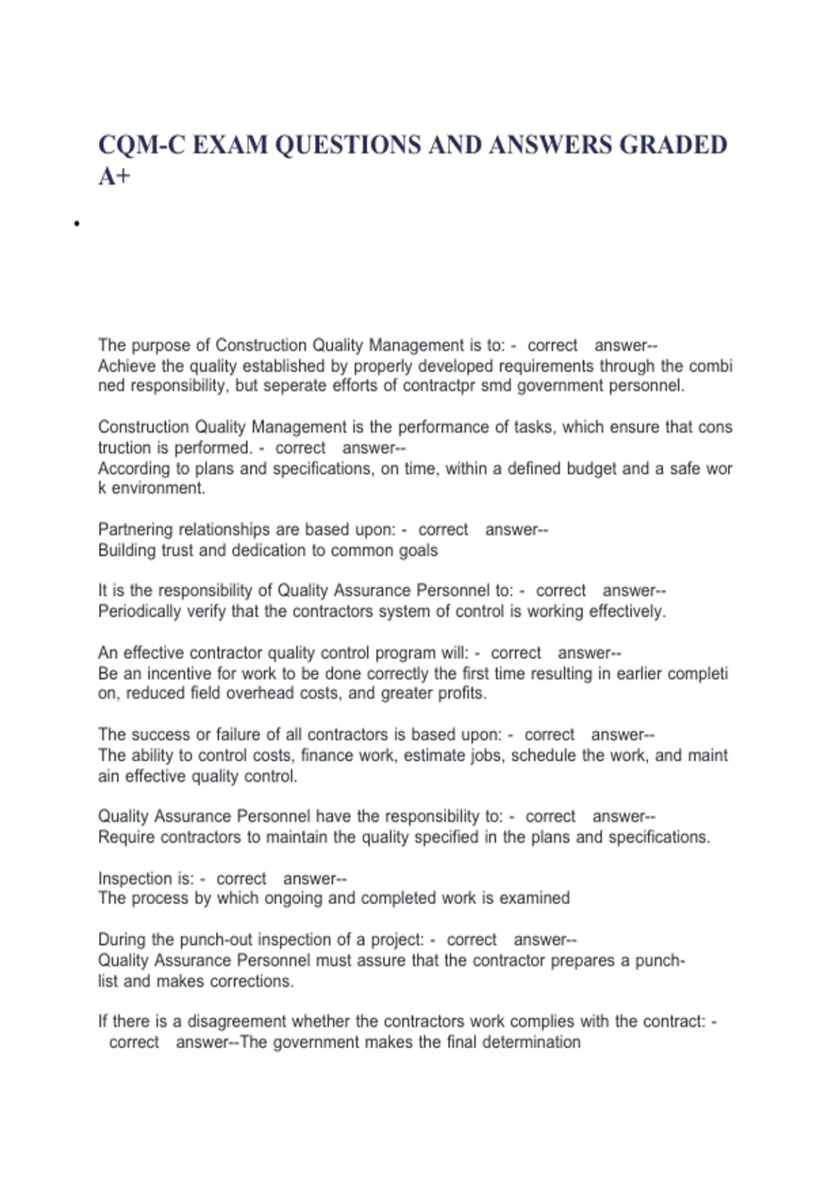 This document contains CQM-C exam-style questions with accurate and verified answers aligned with the ASQ Certified Quality Manager exam domains. It covers leadership, strategic planning, quality management systems, customer-focused organizations, process management, and performance measurement. The material is graded A+ and suitable for structured revision and confident exam preparation.