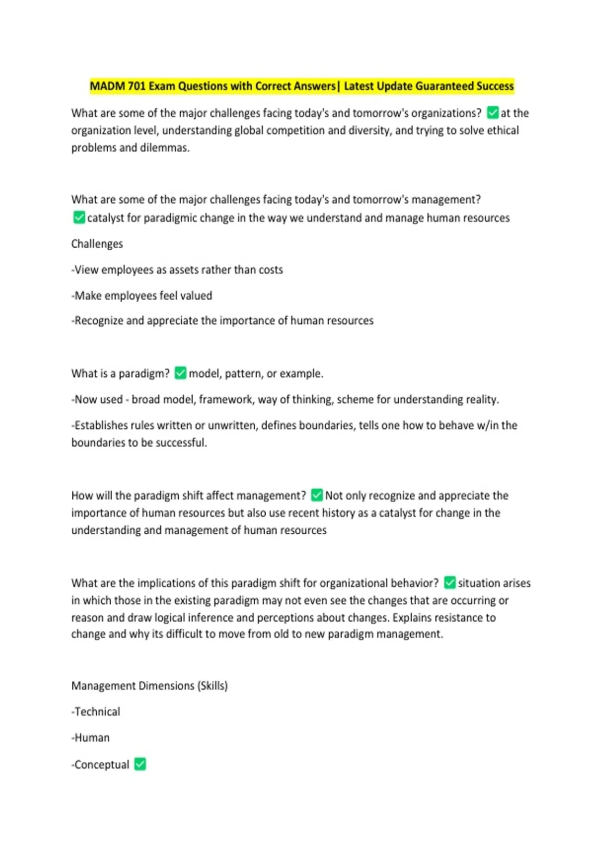 MADM 701 Exam Questions with Correct Answers| Latest Update Guaranteed Success