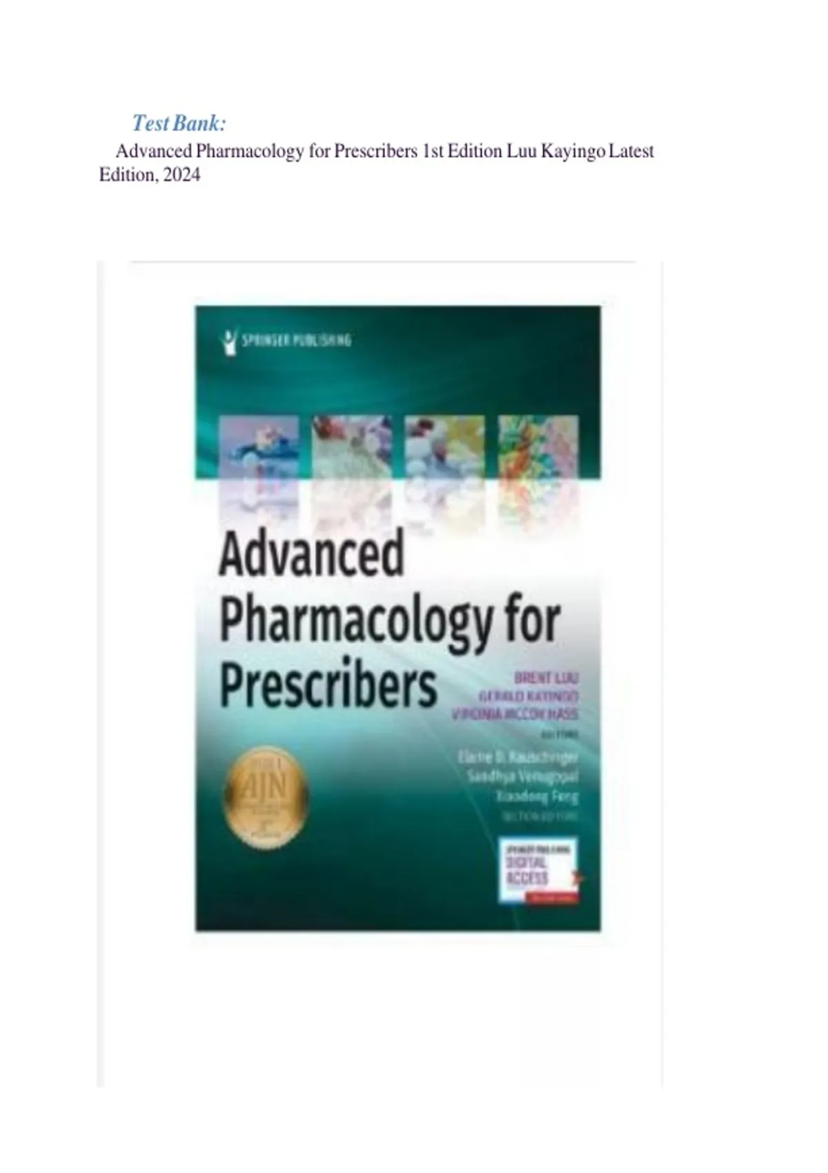 Test Bank for Advanced Pharmacology for Prescribers, 1st Edition (Luu, Kayingo & Hass) A Powerful Learning & Assessment Companion for Advanced Practice Clinicians The Test Bank for Advanced Pharmacology for Prescribers, 1st Edition by Brent Q. Luu, Gerald Kayingo & Virginia McCoy Hass is a meticulously developed resource designed to support advanced practice students—such as nurse practitioners (NPs), physician assistants (PAs), and other prescribers—as they master pharmacotherapeutics and prescribing knowledge. This test bank includes high-quality, exam-style questions across all chapters of the textbook, complete with verified answers and in-depth rationales, making it an indispensable tool for mastery, assessment, and exam readiness. This resource serves as both a study supplement for learners and a teaching/assessment aid for faculty. By providing clarity, depth, and alignment with the textbook, the test bank bridges the gap between theoretical understanding and practical pharmacologic decision-making. Why This Test Bank Matters The textbook Advanced Pharmacology for Prescribers stands out as a modern, applied, evidence-based guide to prescribing and drug therapy. It doesn’t just teach drug facts—it emphasizes clinical reasoning, pharmacokinetics, drug–disease interaction, and lifespan considerations. Springer Publishing Company However, reading alone is rarely enough for proficiency. Students and clinicians benefit greatly when they test their understanding, correct their misconceptions, and practice applying concepts under exam-like conditions. This test bank is built with those goals in mind. Its strengths include: Full alignment with the 1st edition’s chapter layout and learning objectives. Diverse and clinically oriented question types (MCQs, select-all-that-apply, case-based, calculation problems). Verified correct answers to maintain confidence in accuracy. Detailed rationales to teach why an answer is correct (or incorrect) rather than just what answer to choose. Flexibility in use: for self-study, classroom quizzes, review sessions, mock exams, or group learning. In short, it transforms passive reading into active, mastery-oriented learning. Key Features 1. Comprehensive Coverage of All Chapters The test bank spans the full scope of the textbook, covering foundational pharmacology through system-specific therapeutics and special populations. Springer Publishing Company Each chapter is addressed so no topic is left unpracticed. 2. Varied Question Types & Levels Multiple Choice (single best answer) Select-All-That-Apply (SATA/multiple response) Calculation and dosage problems Case-based questions / clinical vignettes Alternate formats (where relevant) This variety prepares learners for real-world exam formats and fosters higher-order thinking. 3. Verified Correct Answers & Rationales Each item comes with a clear explanation: why the selected answer is correct, and why other options are wrong. These rationales deepen understanding and help learners internalize principles—not just memorize answers. 4. Clinical Emphasis & Decision-Making Focus Questions are not just about memorizing drug properties; they emphasize application: patient scenarios, lifespan pharmacology, drug–disease interactions, adverse effect prevention, prescription writing, and stewardship. 5. Tiered Difficulty & Organized for Progression Questions are often tiered (basic → moderate → advanced) so users can build progressively. Educators can also group by difficulty when customizing assessments or practice sets. 6. Searchable Digital Format Delivered in digital formats (PDF, Word, ExamView or similar) that are fully searchable, so users can quickly find questions by chapter, keyword, or drug class. Printable versions also support offline study. Benefits for Students & Clinicians Enhanced Exam Preparedness Frequent practice under exam-like conditions builds speed, confidence, and familiarity with question styles. Stronger Clinical Judgment Rationales and scenario-based items cultivate critical thinking in prescribing and patient care decisions. Improved Retention Repeated exposure and explanation reinforce key pharmacologic and therapeutic principles. Targeted Self‐Assessment Students can diagnose weak areas and focus their study time efficiently. Confidence in Accuracy Verified correct answers reduce doubt and the risk of learning incorrect information. Bridging Theory & Practice The test bank helps learners translate pharmacological theory to real-world prescribing contexts. Benefits for Faculty & Educators Time-Saving Assessment Tool Use pre-written, high-quality questions rather than building exams from scratch. Customizable Exams & Quizzes Select by chapter, topic, difficulty level, or format to match your course needs. Reliable Answer Key Rationales serve as a guide for teaching and debriefing, not just grading. Active Learning Support Use questions in class polls, group work, case discussions, or flipped classroom settings. Consistency with Textbook Questions directly map to the textbook’s structure and learning objectives, ensuring alignment between instruction and evaluation. Topics & Chapter Outline According to the official publisher, the textbook includes foundational pharmacologic principles and system-based prescribing topics. Springer Publishing Company Key topics likely reflected in the test bank include: Part I: Foundations of Pharmacology & Prescribing Chapter 1: Evidence-Based Clinical Practice Guidelines Chapter 2: Pharmacokinetics Chapter 3: Pharmacodynamics Chapter 4: Pharmacogenomics / Pharmacogenetics Chapter 5: Pharmacology Across the Lifespan Chapter 6: Drug Therapy in Special Populations Chapter 7: Drug Development & Approval Chapter 8: Prescription Writing Foundations Chapter 9: Controlled Substance Prescribing Chapter 10: Antibiotic Stewardship Chapter 11: Applied Calculations for Prescribing Chapter 12: Promoting Adherence & Therapeutic Monitoring Part II: Sy