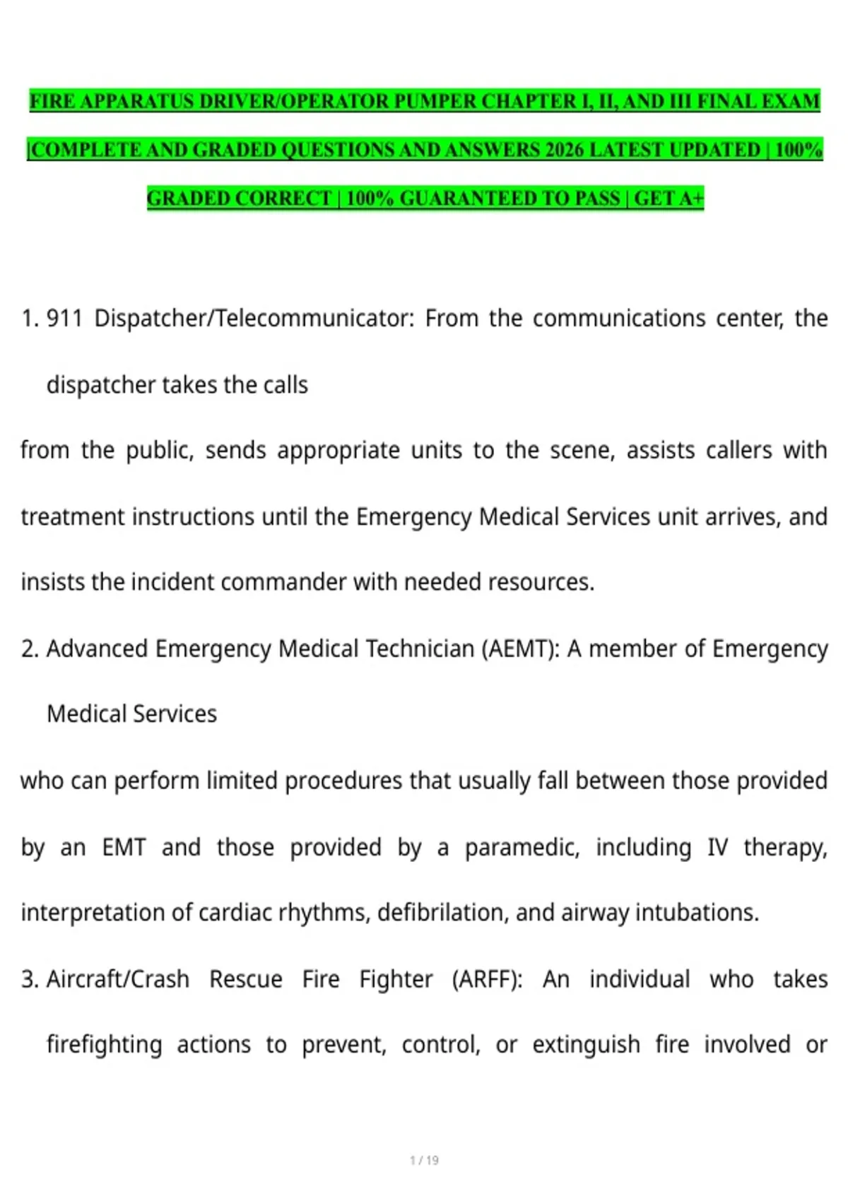 FIRE APPARATUS DRIVER/OPERATOR PUMPER CHAPTER I, II, AND III FINAL EXAM |COMPLETE AND GRADED QUESTIONS AND ANSWERS 2026 LATEST UPDATED | 100% GRADED CORRECT | 100% GUARANTEED TO PASS | GET A+
