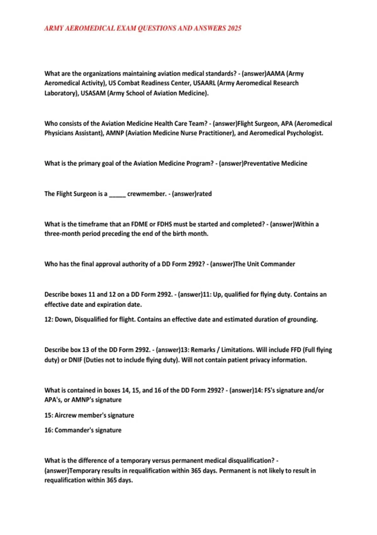 ,ARMY AEROMEDICAL EXAM QUESTIONS AND ANSWERS 2025