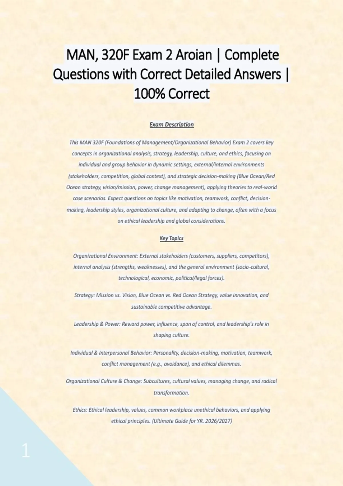 MAN, 320F Exam 2 Aroian | Complete Questions with Correct Detailed Answers | 100% Correct Exam Description This MAN 320F (Foundations of Management/Organizational Behavior) Exam 2 covers key concepts in organizational analysis, strategy, leadership, culture, and ethics, focusing on individual and group behavior in dynamic settings, external/internal environments (stakeholders, competition, global context), and strategic decision-making (Blue Ocean/Red Ocean strategy, vision/mission, power, change management), applying theories to real-world case scenarios. Expect questions on topics like motivation, teamwork, conflict, decision-making, leadership styles, organizational culture, and adapting to change, often with a focus on ethical leadership and global considerations. Key Topics Organizational Environment: External stakeholders (customers, suppliers, competitors), internal analysis (strengths, weaknesses), and the general environment (socio-cultural, technological, economic, political/legal forces). Strategy: Mission vs. Vision, Blue Ocean vs. Red Ocean Strategy, value innovation, and sustainable competitive advantage. Leadership & Power: Reward power, influence, span of control, and leadership's role in shaping culture. Individual & Interpersonal Behavior: Personality, decision-making, motivation, teamwork, conflict management (e.g., avoidance), and ethical dilemmas. Organizational Culture & Change: Subcultures, cultural values, managing change, and radical transformation. Ethics: Ethical leadership, values, common workplace unethical behaviors, and applying ethical principles. (Ultimate Guide for YR. 2026/2027)