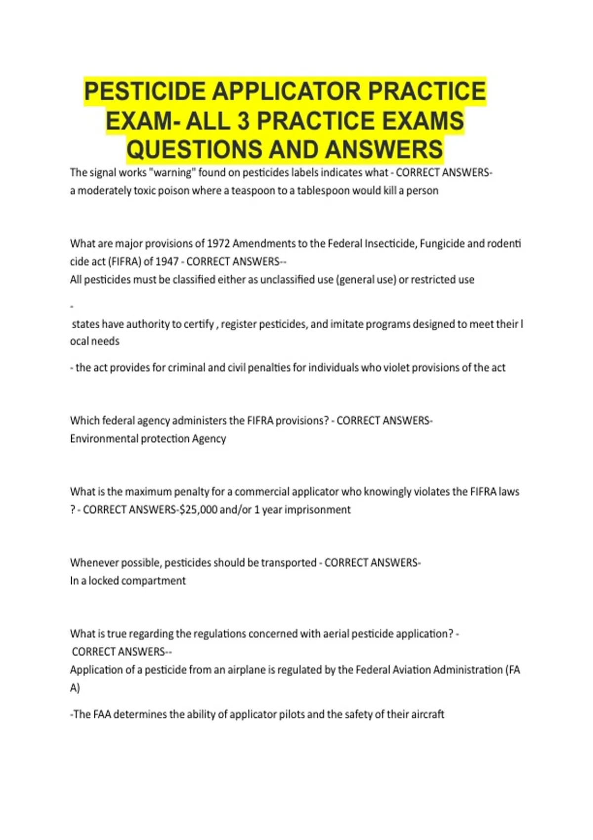 PESTICIDE APPLICATOR PRACTICE EXAM- ALL 3 PRACTICE EXAMS QUESTIONS AND ANSWERS