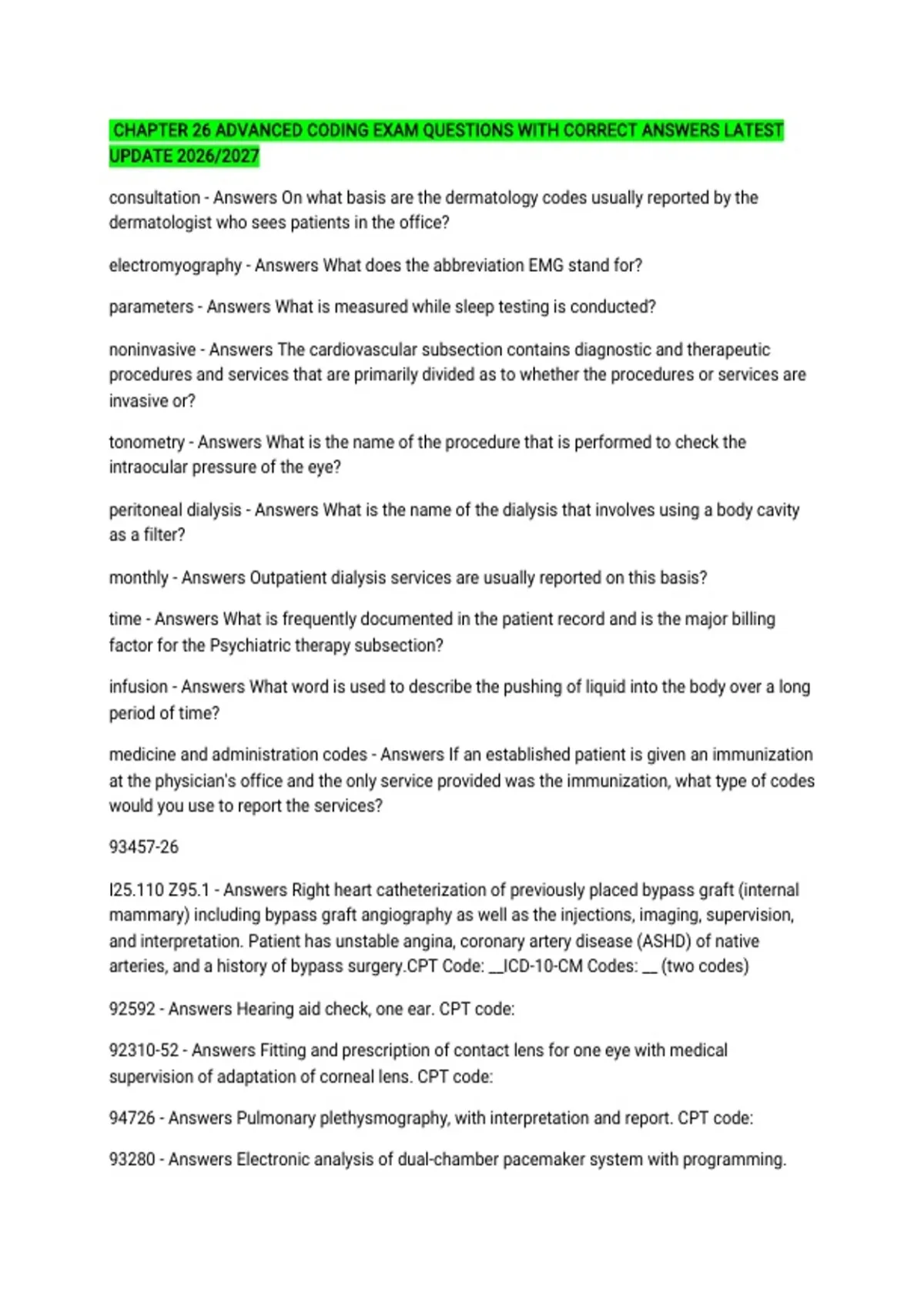 CHAPTER 26 ADVANCED CODING EXAM QUESTIONS WITH CORRECT ANSWERS LATEST UPDATE 2026/2027 consultation - Answers On what basis are the dermatology codes usually reported by the dermatologist who sees patients in the office? electromyography - Answers What does the abbreviation EMG stand for? parameters - Answers What is measured while sleep testing is conducted? noninvasive - Answers The cardiovascular subsection contains diagnostic and therapeutic procedures and services that are primarily divided as to whether the procedures or services are invasive or? tonometry - Answers What is the name of the procedure that is performed to check the intraocular pressure of the eye? peritoneal dialysis - Answers What is the name of the dialysis that involves using a body cavity as a filter? monthly - Answers Outpatient dialysis services are usually reported on this basis? time - Answers What is frequently documented in the patient record and is the major billing factor for the Psychiatric therapy subsection? infusion - Answers What word is used to describe the pushing of liquid into the body over a long period of time? medicine and administration codes - Answers If an established patient is given an immunization at the physician's office and the only service provided was the immunization, what type of codes would you use to report the services? 93457-26 I25.110 Z95.1 - Answers Right heart catheterization of previously placed bypass graft (internal mammary) including bypass graft angiography as well as the injections, imaging, supervision, and interpretation. Patient has unstable angina, coronary artery disease (ASHD) of native arteries, and a history of bypass surgery.CPT Code: __ICD-10-CM Codes: __ (two codes) 92592 - Answers Hearing aid check, one ear. CPT code: 92310-52 - Answers Fitting and prescription of contact lens for one eye with medical supervision of adaptation of corneal lens. CPT code: 94726 - Answers Pulmonary plethysmography, with interpretation and report. CPT code: 93280 - Answers Electronic analysis of dual-chamber pacemaker system with programming. CPT code: - Answers These CPT codes are used to report moderate sedation provided by a physician. 96365 J1561 M33.90 - Answers Assign HCPCS Level II and diagnosis code as appropriate:An established patient was treated with intravenous immunoglobulin (IVIG), nonlyophilized (Gamunex)—500 mg. The medical record documents dermatomyositis. The infusion was administered in the office and lasted 1 hour.CPT Code: __HCPCS Code: __ICD-10-CM Code: __ 90658 G0008