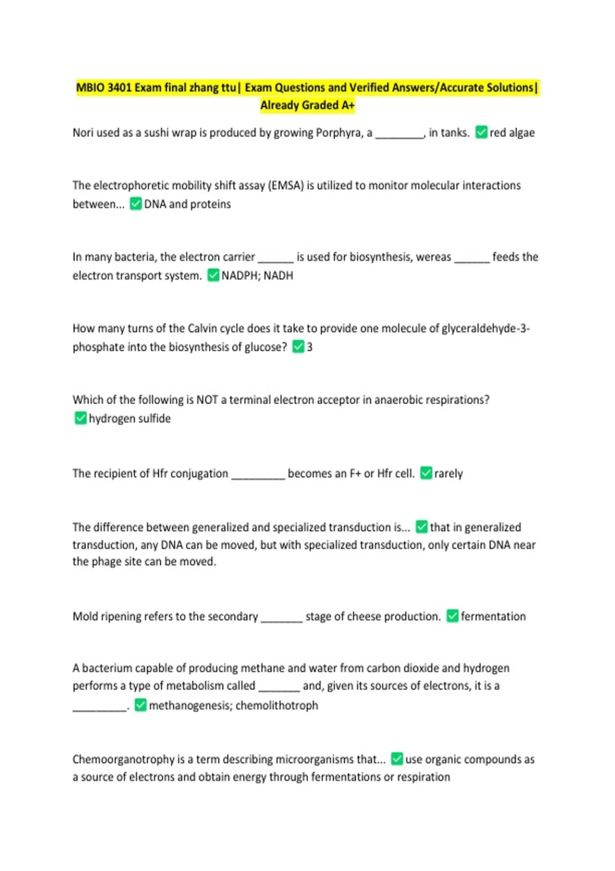 MBIO 3401 Exam final zhang ttu| Exam Questions and Verified Answers/Accurate Solutions