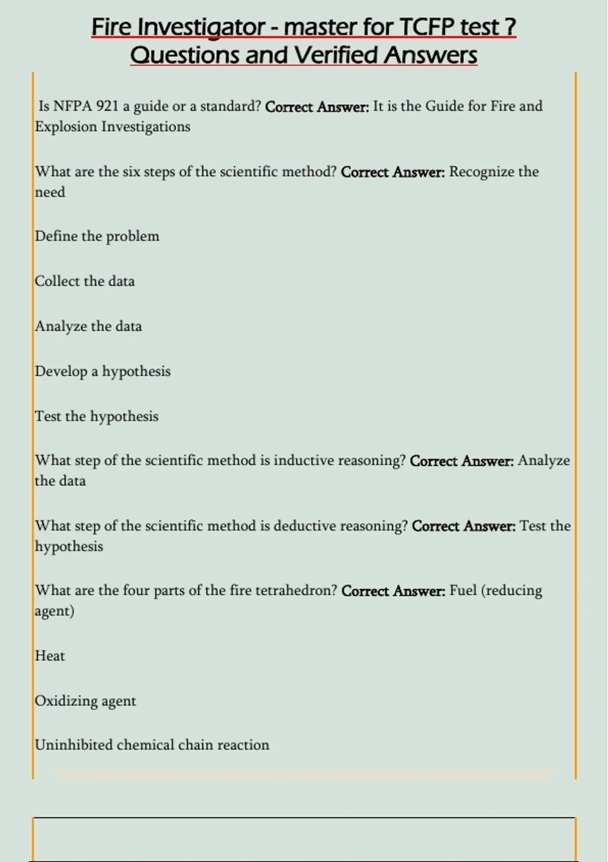 Is NFPA 921 a guide or a standard? Correct Answer: It is the Guide for Fire and