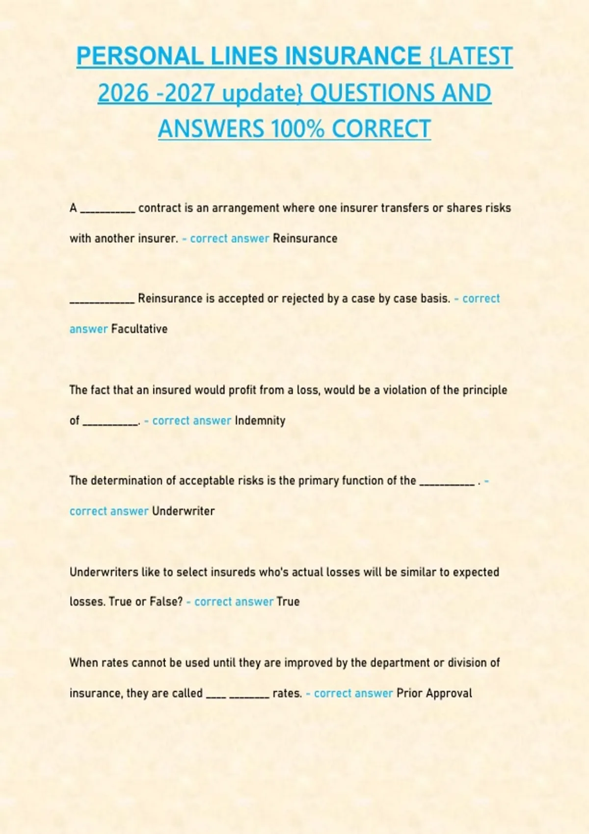 PERSONAL LINES INSURANCE PRACTICE EXAM {LATEST 2026 -2027 UPDATE STUDY BUNDLE PACKAGE WITH SOLUTIONS} QUESTIONS AND ANSWERS 100% CORRECT