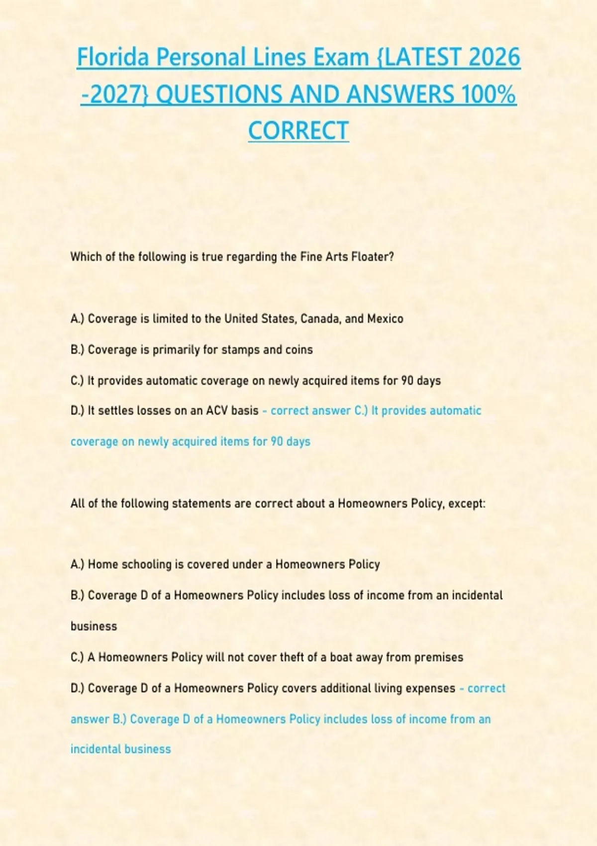 PERSONAL LINES INSURANCE PRACTICE EXAM {LATEST 2026 -2027 UPDATE STUDY BUNDLE PACKAGE WITH SOLUTIONS} QUESTIONS AND ANSWERS 100% CORRECT
