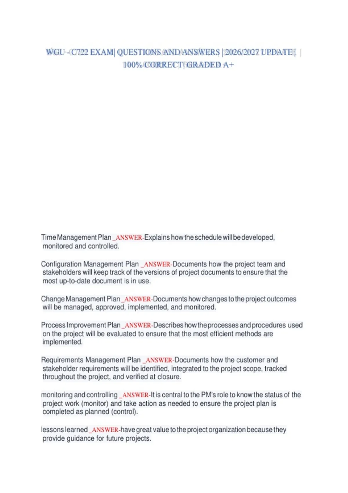 WGU C722 PROJECT MANAGEMENT OA FINAL EXAM BANK CURRENTLY TESTING COMPLETE EXAM QUESTIONS WITH DETAILED VERIFIED ANSWERS /EXPERT VERIFIED /ALREADY GRADED A+/BRAND NEW!! WGU C722 PROJECT MANAGEMENT OA FINAL EXAM BANK CURRENTLY TESTING COMPLETE EXAM QUESTIONS WITH DETAILED VERIFIED ANSWERS /EXPERT VERIFIED /ALREADY GRADED A+/BRAND NEW!! WGU C722 PROJECT MANAGEMENT OA FINAL EXAM BANK CURRENTLY TESTING COMPLETE EXAM QUESTIONS WITH DETAILED VERIFIED ANSWERS /EXPERT VERIFIED /ALREADY GRADED A+/BRAND NEW!!