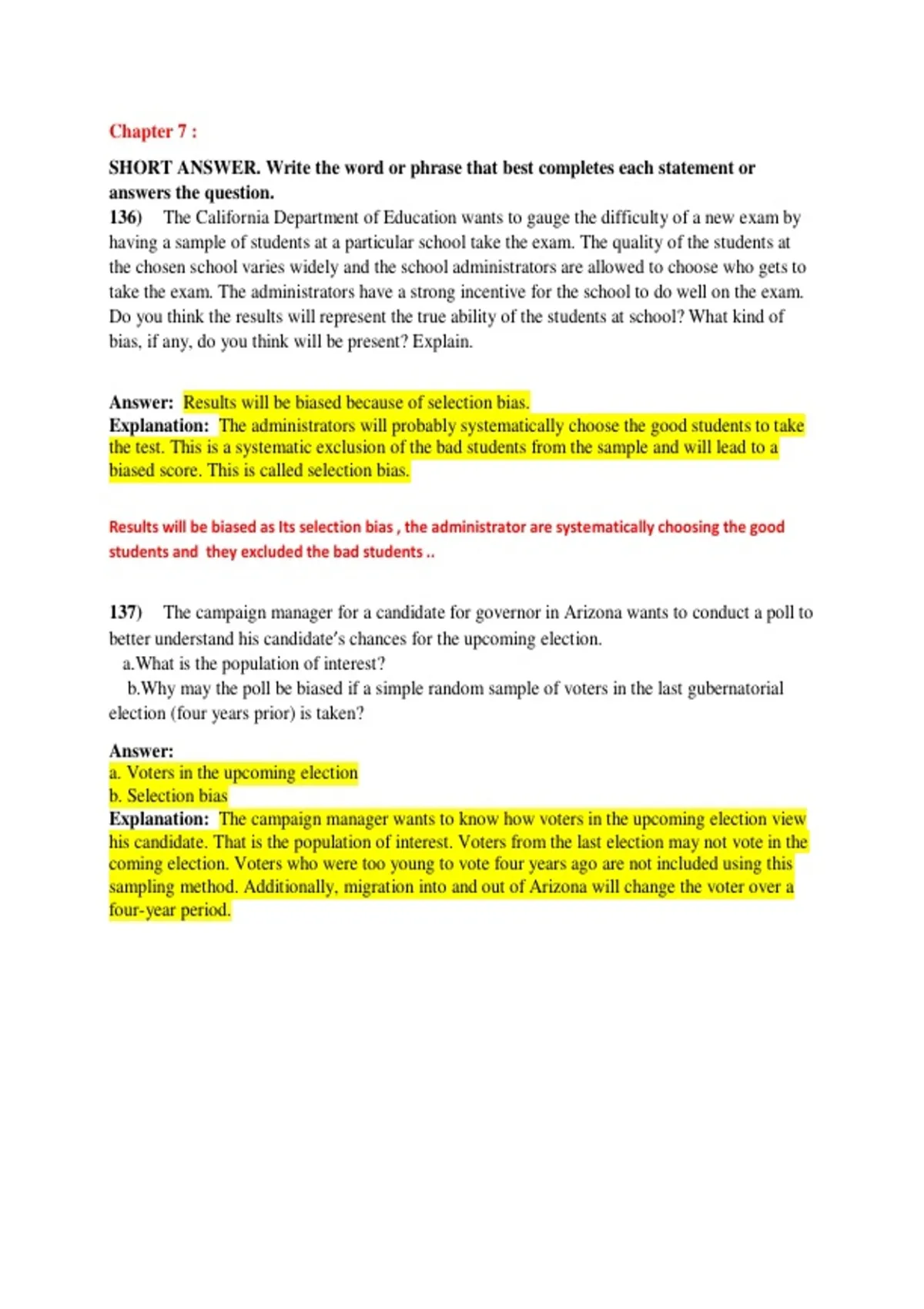 having a sample of students at a particular school take the exam. The quality of the students at