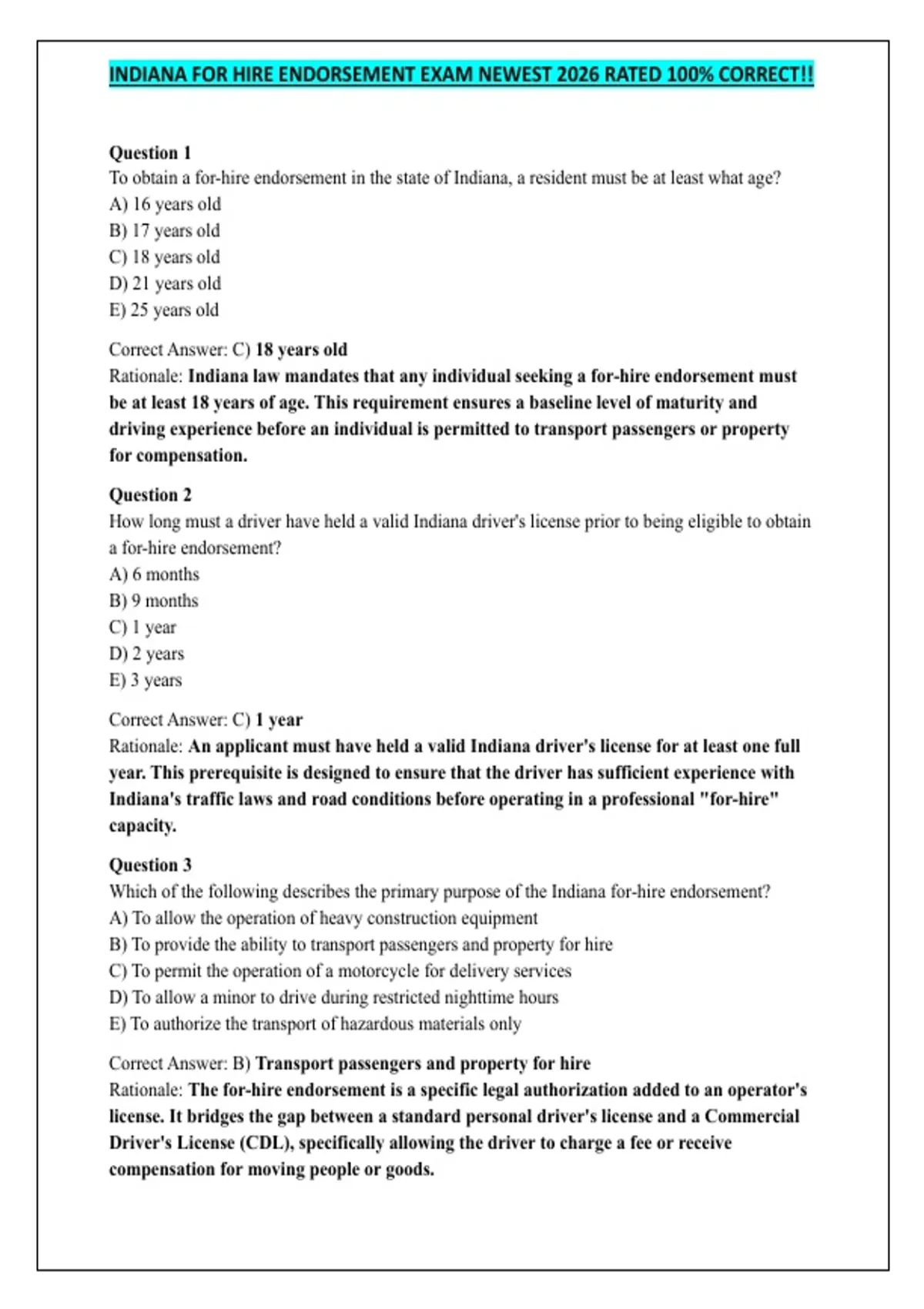 INDIANA FOR HIRE ENDORSEMENT EXAM NEWEST 2026 RATED 100% CORRECT!!