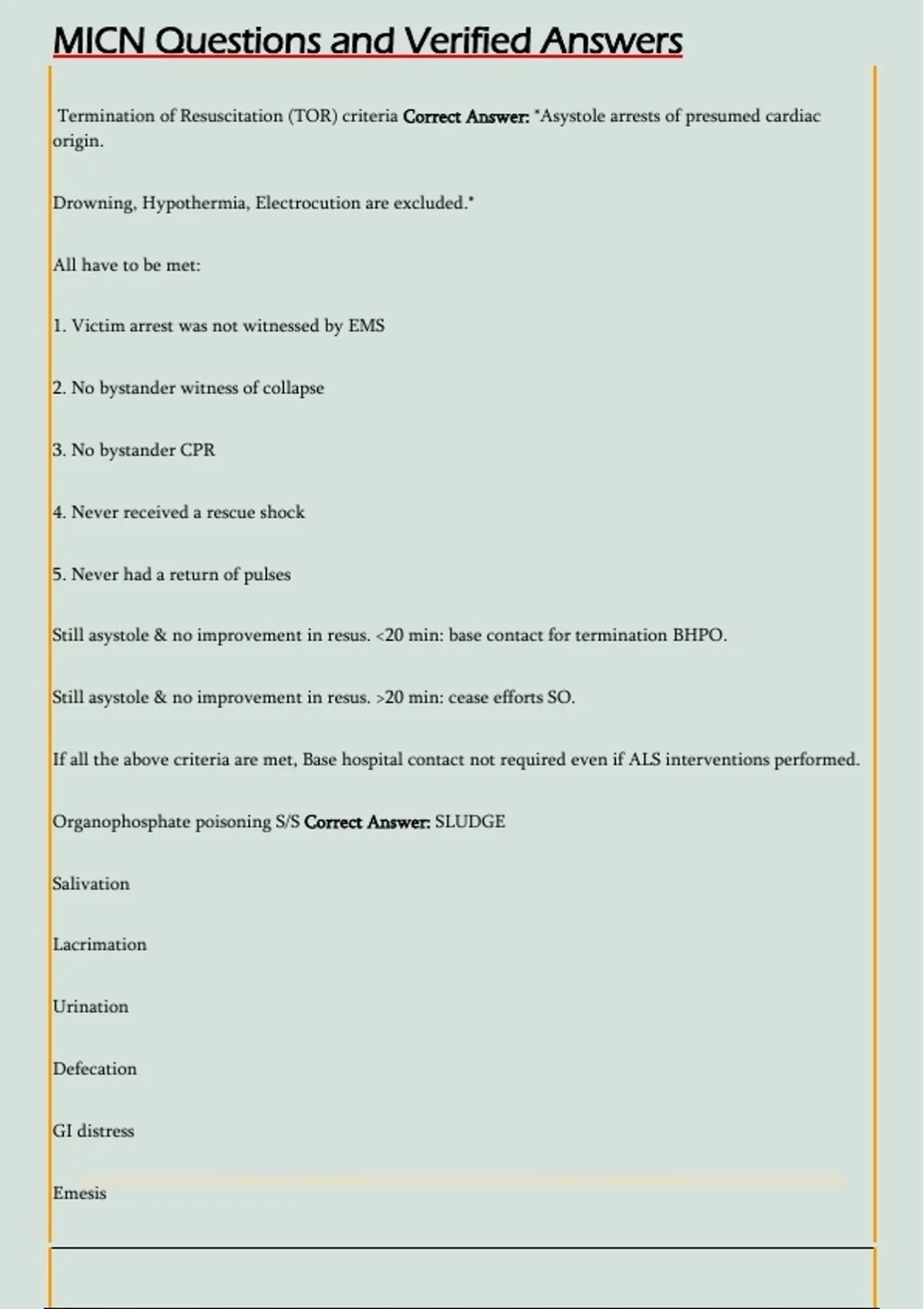 Termination of Resuscitation (TOR) criteria Correct Answer: *Asystole arrests of presumed cardiac