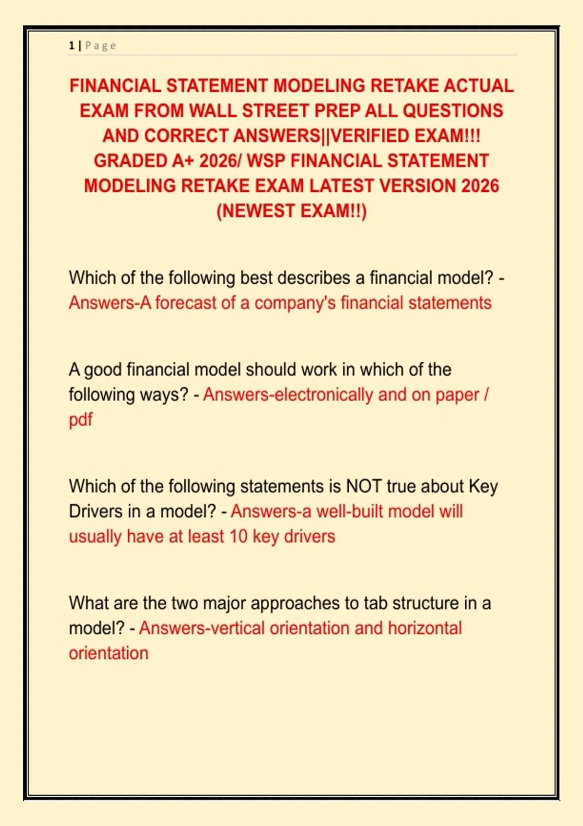 FINANCIAL STATEMENT MODELING RETAKE ACTUAL EXAM FROM WALL STREET PREP ALL QUESTIONS AND CORRECT ANSWERS||VERIFIED EXAM!!! GRADED A+ 2026/ WSP FINANCIAL STATEMENT MODELING RETAKE EXAM LATEST VERSION 2026 (NEWEST EXAM!!)