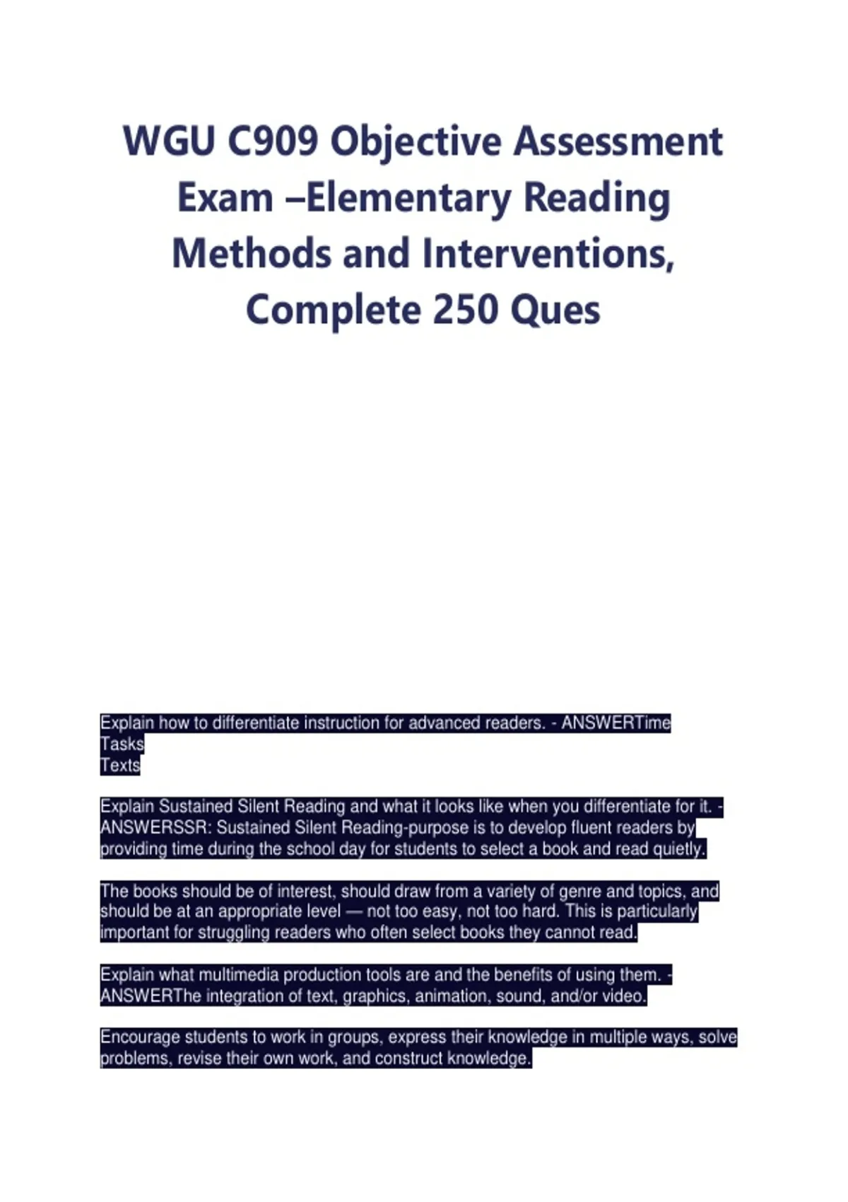 WGU C909 Objective Assessment Exam –Elementary Reading Methods and Interventions, Complete 250 Ques