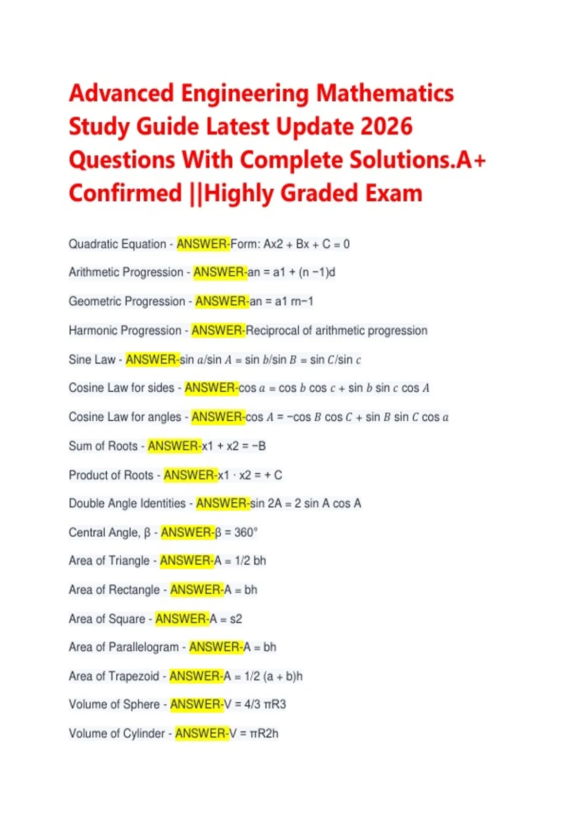 Advanced Engineering Mathematics Study Guide 2026: Exam Questions & Complete A+ Solutions
