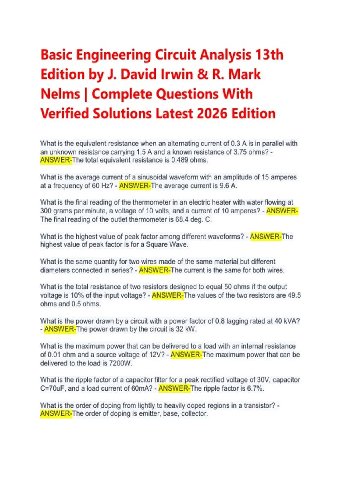 Struggling with circuit problems? Get the complete solutions manual for Basic Engineering Circuit Analysis 13th Edition by Irwin & Nelms. All chapters (1-19) included with step-by-step, verified solutions for homework and exam prep. Updated for 2026. Instant access.