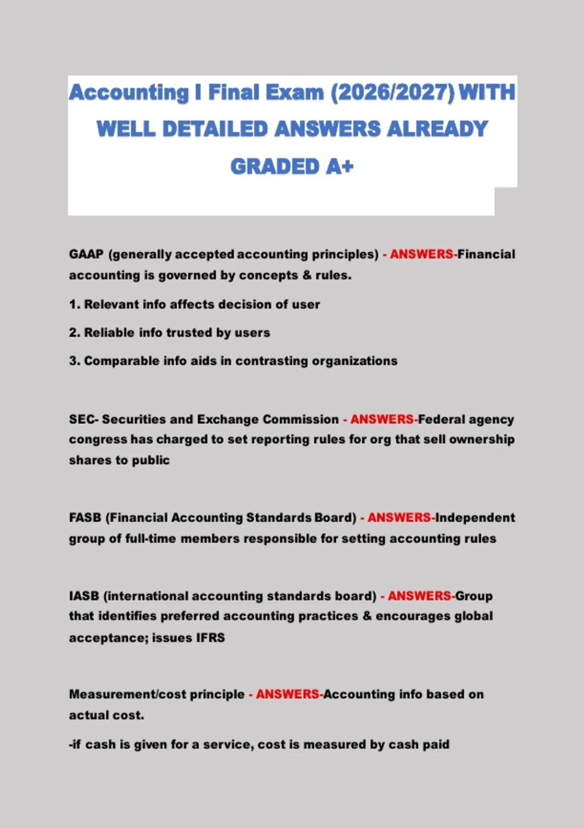 Accounting I Final Exam (2026/2027) WITH WELL DETAILED ANSWERS ALREADY GRADED A+
